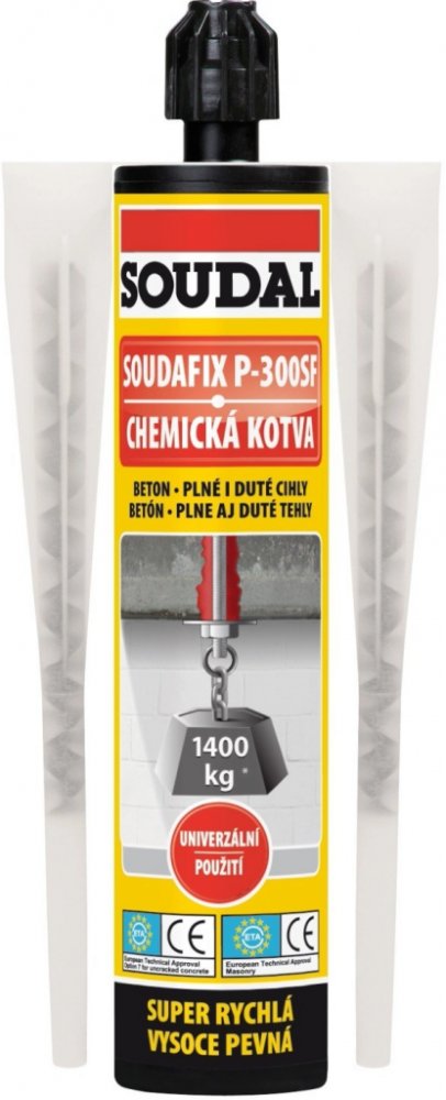 Chemická kotva SOUDAL SOUDAFIX P-300SF Dvousložková kotvicí hmota pro kotvení závitových tyčí (ETA: M8 - M24), závitových pouzder, armovacích tyčí, různých kovových profilů apod. bez působení tlaku na okolní materiál. Je vhodná do plných i dutých materiálů jako netrhlinový beton, pórobeton, plné nebo duté cihly, přírodní kámen, sádrokarton apod. Použití - Bezpečné kotvení s vysokou únosností v plných i dutých stavebních materiálech - Kotvení bez působení tlaku na okolní materiál i v blízkosti okrajů a rohů podkladu - Kotvení závitových tyčí a pouzder, kovových kotev, armovacích tyčí atd. - Rychlé kotvení lešení - Pro všechny běžné porézní stavební materiály, horší přilnavost na hladké neporézní povrchy Vlastnosti chemické kotvy SOUDAL SOUDAFIX P-300SF - Snadná a rychlá aplikace - Aplikace běžnou pistolí na běžné kartuše - Vysoce pevná - Super rychlé vytvrzení - Bez styrenu (nízký zápach) - Široká oblast využití včetně kotvení do vlhkého podkladu - Kotvení do stropů - Opakovatelně použitelná (po výměně směšovací trysky) - Ideální pro kotvení do dutých cihel v kombinaci se sítkem - Vytváří vodotěsné a nepropustné upevnění - Evropské schválení ETA 11/0447 na základě ETAG 001 část 1 a 5 pro kotvení do netrhlinového betonu - Evropské technické posouzení ETA 13/0064 na základě ETAG 029 pro kotvení do zdiva Podrobnější informace naleznete v technickém listu k dispozici ke stažení v sekci ""Datové listy"".