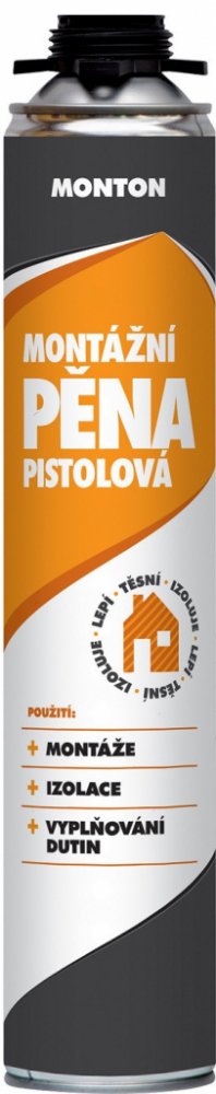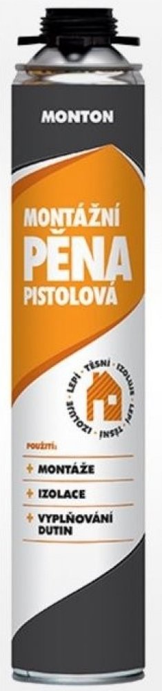Montážní pěna Monton pistolová, jednosložková rozpínavá polyuretanová pěna určena k profesionální montáži a utěsňování rámů oken a dveří, vyplňování stavebních spár a dutin, upevňování střešních prvků, nanášení tepelně izolačních vrstev apod. Připravena k použití prostřednictvím aplikační pistole.