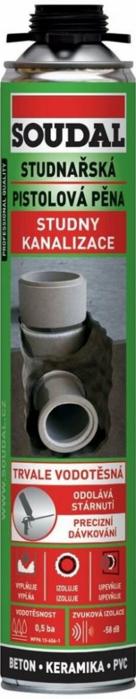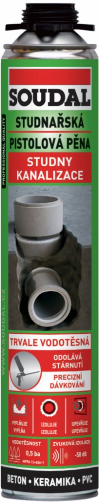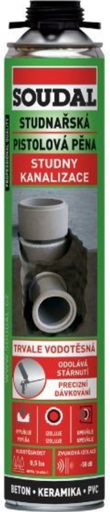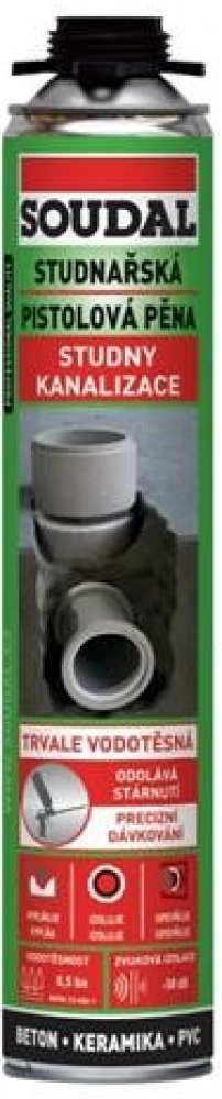 Soudal studnařská montážní pěna pistolová 750 ml Studnařská pistolová pěna Speciální vodotěsná polyuretanová pěna s odolností vůči trvalému působení vody a organických nečistot. Vhodná pro přímý styk s pitnou vodou. Má minimální nasákavost a odolává půdní kyselosti i bakteriím. Výborně přilne na většinu stavebních materiálů včetně PVC (mimo PP, PE, PTFE), má vynikající tepelně a zvukově izolační schopnosti, po vytvrzení je přetíratelná běžnými nátěrovými hmotami, vhodná k profesionálnímu využití. Charakteristika produktu vynikající objemová stabilita po v