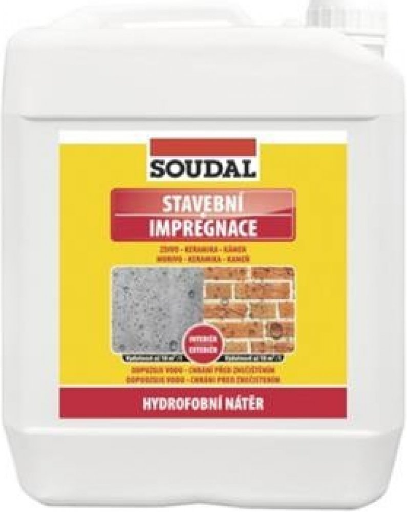 Soudal stavební impregnace 5 l odpuzuje vodu – hydrofobní zvyšuje životnost savých stavebních materiálů zachovává nový vzhled, omezuje vznik výkvětů vhodný pro exteriér i interiér snižuje míru ulpívání nečistot na povrchu vytváří samočisticí efekt zvyšuje odolnost vůči růstu mechů a řas odolává působení kyselých dešťů. vhodný na ochranu nových i údržbu starých povrchů nemění původní vzhled materiálu paropropustný, nechává podklad „dýchat“ PŘÍKLADY POUŽITÍ impregnace fasád z lícového zdiva a obkladových pásků ochrana obkladů a fasád z pří