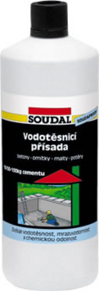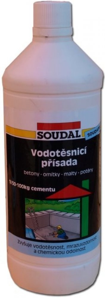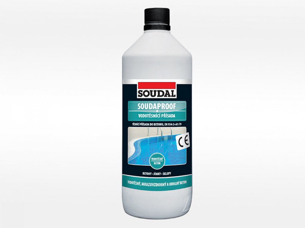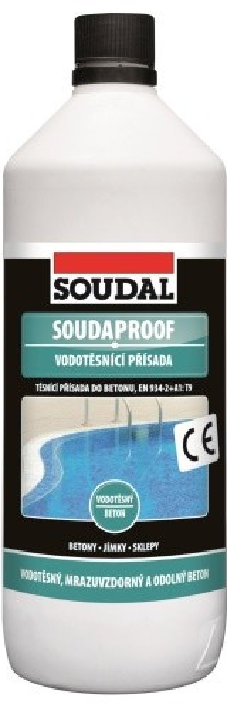 Přísada vodotěsnicí SOUDAL Soudaproof 1 l. SOUDAL Soudaproof je přísada vhodná pro výrobu konstrukcí, které mají odolávat vnějšímu tlaku vody (opěrné stěny, podzemní podlaží, sklepy, základy, podlahy, střechy, montážní jámy apod.) nebo být schopny zadržovat či vést vodu (bazény, nádrže, umělá jezírka, jímky, vodoteče, koryta apod.)