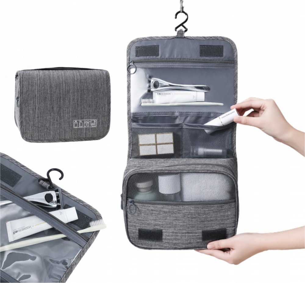 Taška na háček slouží k uložení kosmetiky a kosmetických doplňků na cestách. Je vyrobena z velmi pevného a voděodolného materiálu. Má 3 kapsy a po rozložení je veškeré příslušenství na dosah.
