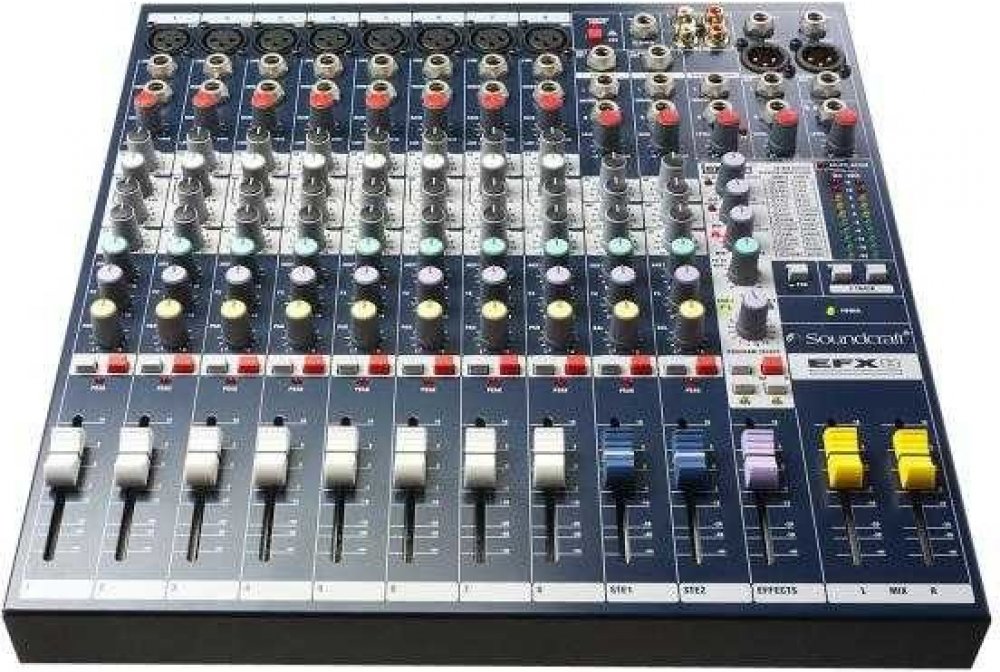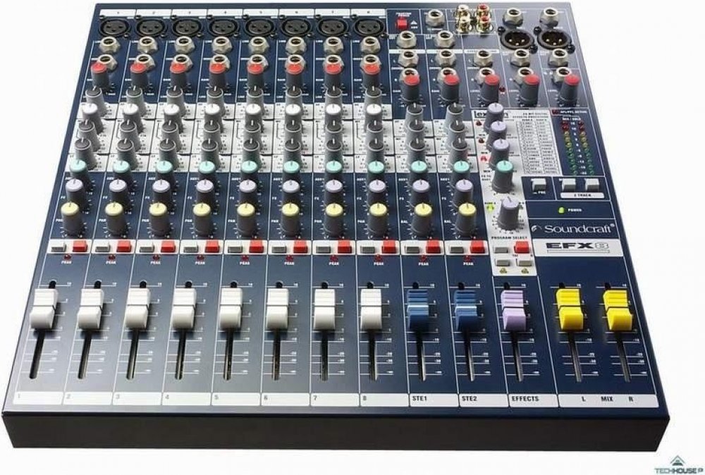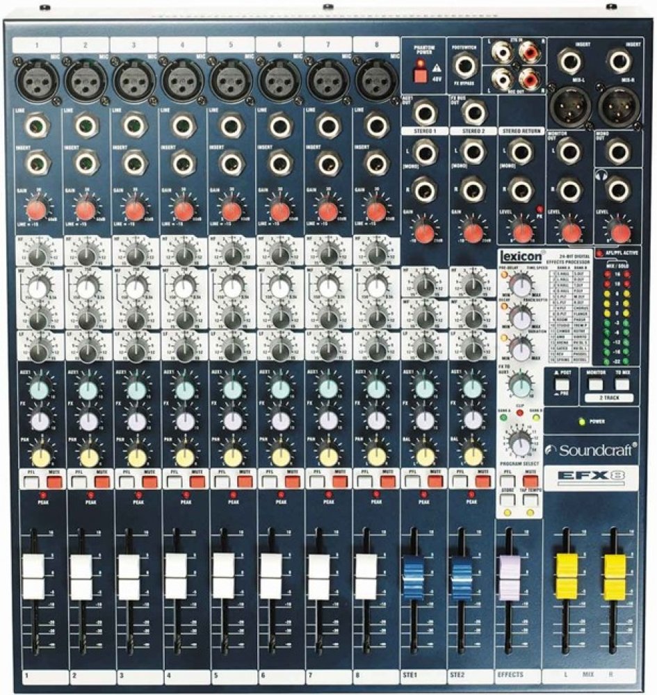 SOUNDCRAFT EFX8 je kompaktní mixážní pult s dvanácti vstupními kanály (8 mono, 2 stereo), jednou efektovou (FX), jednou pomocnou (AUX) sběrnicí a integrovanou digitální efektovou jednotkou Lexicon. Pult je na mono kanálech vybaven mikrofonními předzesilovači GB30 a třípásmovým British ekvalizérem s laditelnými středy. Stereo kanály disponují ekvalizérem s pevně přiřazenými frekvencemi. Přesné ovládání hlasitosti umožňují 60mm posuvné fadery. Robustní celokovové provedení zaručuje vysokou odolnost při použití v mobilních ozvučovacích sestavách. VlastnostiPředzesilovače GB30, které firma využívá i na svých profesionálních velkoformátových pultech, zaručují díky možnosti vysokého přebuzení čistý nezkreslený zvuk i při maximálních signálových špičkách. Součástí předzesilovačů je globální phantomové napájení a insert vstup pro připojení externích procesorů. Výbavu každého kanálu doplňuje LED dioda signalizující přebuzení a přepínače PFL a MUTE. DSP jednotka Lexicon využívá 24bitový AudioDNA chip, který je nasazen i ve vysoce uznávaném procesoru MX400. Nabízí celkem 32 programů s možností editace tří parametrů u každého algoritmu. Rychlost efektů typu Echo / Delay lze synchronizovat s tempem skladby prostřednictvím tlačítka Tap Tempo. Série EFXV rámci série EFX nabízí společnost Soundcraft kompaktní mixážní pulty se zabudovanými 24bitovými digitálními efektovými procesory. Pulty disponují všemi funkcemi oblíbené řady EPM a jsou vybaveny pokročilými firemními technologiemi. Skvělý zvuk zajišťují špičkové mikrofonní předzesilovače GB30, efektování signálu má na starosti procesor Lexicon s AudioDNA čipem. Vybírat lze ze dvou modelů, které si liší počtem vstupních kanálů. EFX8 nabízí dva stereo vstupy a 8 vstupů mikrofonních. EFX12 je vybavený 12 mikrofonními a dvěma stereo vstupy. Specifikace