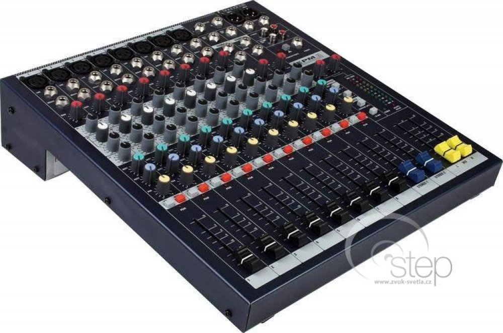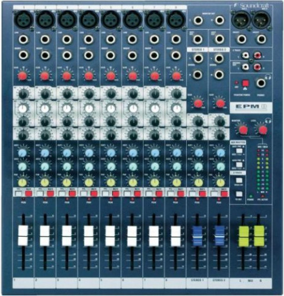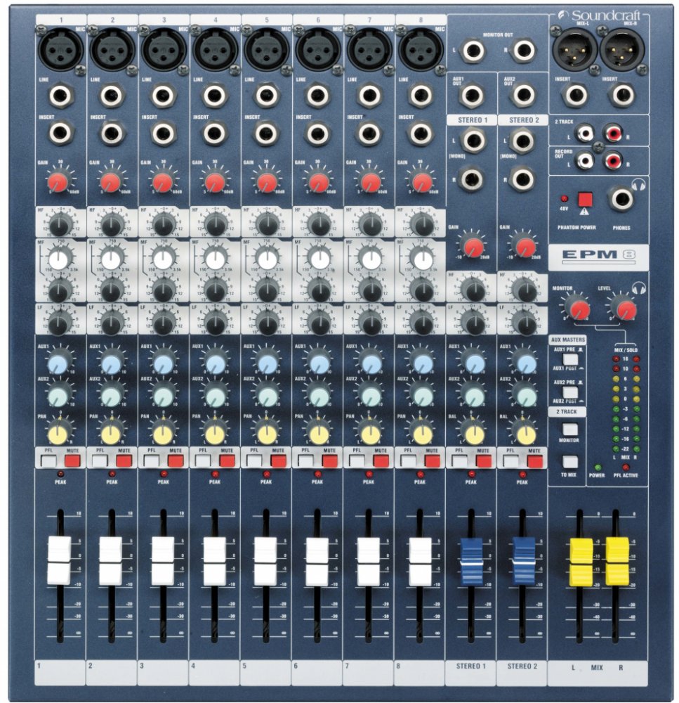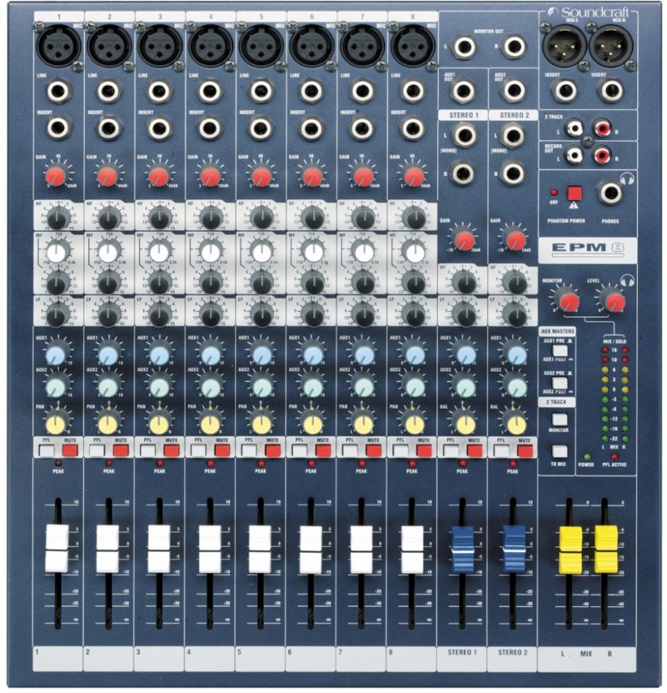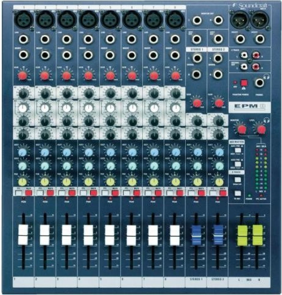 EPM8 je kompaktní víceúčelový mixážní pult s dvanácti vstupními kanály (8 mono, 2 stereo) a dvěma konfigurovatelnými pomocnými sběrnicemi (AUX). Na mono kanálech je vybavený mikrofonními předzesilovači GB30 a třípásmovým ekvalizérem s laditelnými středy. Stereo kanály disponují dvoupásmovým ekvalizérem s pevně přiřazenými frekvencemi. Přesné ovládání hlasitosti umožňují 60mm posuvné fadery. Robustní celokovové provedení zaručuje vysokou odolnost při použití v mobilních ozvučovacích sestavách. VlastnostiPředzesilovače GB30, které firma využívá i na svých profesionálních velkoformátových pultech, zaručují díky možnosti vysokého přebuzení čistý nezkreslený zvuk i při maximálních signálových špičkách. Součástí předzesilovačů je globální phantomové napájení a insert vstup pro připojení externích procesorů. Výbavu každého kanálu doplňuje ovladač citlivosti (GAIN), potenciometry pomocných sběrnic (AUX1, AUX2), stereopozice (PAN/BAL), LED dioda signalizující přebuzení a přepínače PFL a MUTE. Smíchaný audio signál je směrován do hlavních XLR (L+R), monitorovacích TRS (L+R) a nahrávacích RCA (L+R) výstupů. Série EPMSérie EPM zahrnuje kompaktní víceúčelové mixážní pulty, které jsou vybaveny kvalitními komponenty používanými i u profesionálních velkoformátových pultů značky Soundcraft. Díky špičkovým mikrofonním předzesilovačům GB30 disponují čistým nezkresleným zvukem, přehledný layout usnadňuje celkové ovládání a kvalitní zpracování zaručuje vysokou odolnost při každodenním použití. Pulty najdou uplatnění při živém ozvučování, v divadlech nebo v přednáškových prostorech. Vybírat lze ze tří modelů (EPM6, EPM8, EPM12), které se liší počtem mikrofonních vstupů. Specifikace