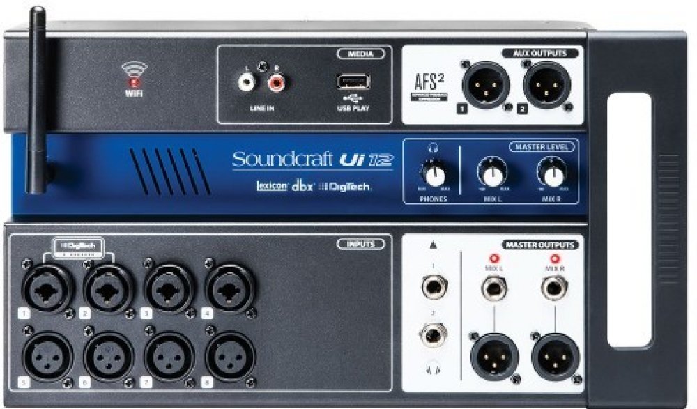 Digitální mixážní pult, Ui série, WiFi dálkové ovládání prostřednictvím libovolného zařízení Windows/Android/iOS/Linux, 12 kanálů, 4x mikrofonní vstup, 4x mic/line vstup, 2x nástrojový vstup, 2x USB vstup 2x RCA vstup, 2x Aux, 2x sluchátkový výstup, 3x DSP procesor Lexicon, Ampmodelingový procesor DigiTech pro kytaru, eliminátory zpětné vazby DBX