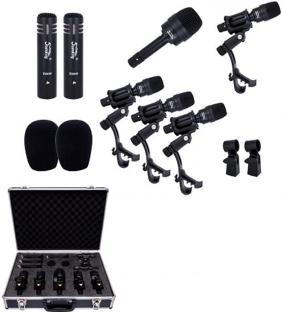 Tato série profesionálních bicích souprav je navržena speciálně pro perkusní bicí, jazzy bicí a jiné nástroje. \nBalení s přenosným hliníkovým pouzdrem, které je odolné, má také dobrý nárazuvzdorný účinek s vložkou z perlové pěny. Profesionální sestava pro bicí soupravy umožňuje přenos zvuku různých typů pomocí vhodného typu mikrofonu: basový bubnový mikrofon je navržen speciálně pro kopák a nízkofrekvenční hudební nástroje díky své výjimečné frekvenční odezvě; tabour mic je ideální pro tom-tomy a snare bubny; kondenzátorový mikrofon je vynikající při reprodukci zvuků činelů, klavírů, atd. \nVšechny bicí mikrofony jsou navrženy se standardním adaptérem 5/8 "nebo 3/8", aby odpovídaly všem druhům stojanů na mikrofon a standardnímu konektoru XLR (F), který se hodí pro všechny druhy zvukových nástrojů. \n