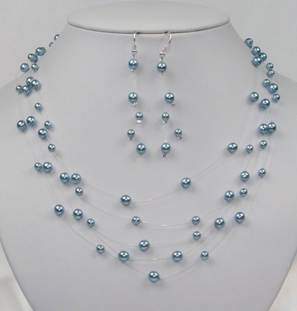 Soupravy bižuterie - Korálky a perličky, 5-K-K-5RS-MS03, Modrá tyrkysová - stříbro. Souprava svatební bižuterie z korálků - náhrdelník + náušnice s afroháčkemNáhrdelník 5-řadý, kombinace perliček na jemném silonu. Náhrdelník l= 42cm + 5cm adjustový řetízek, naušnice l= 5cm Souprva byla vyrobena naším dodavatelem v Jablonci nad Nisou a splňuje veškeré požadavky na kvalitu naší značky Made in Jablonec. Je vhodná zejména pro ženy obávající se o své zdraví při pozužití štrasové bižuterie.