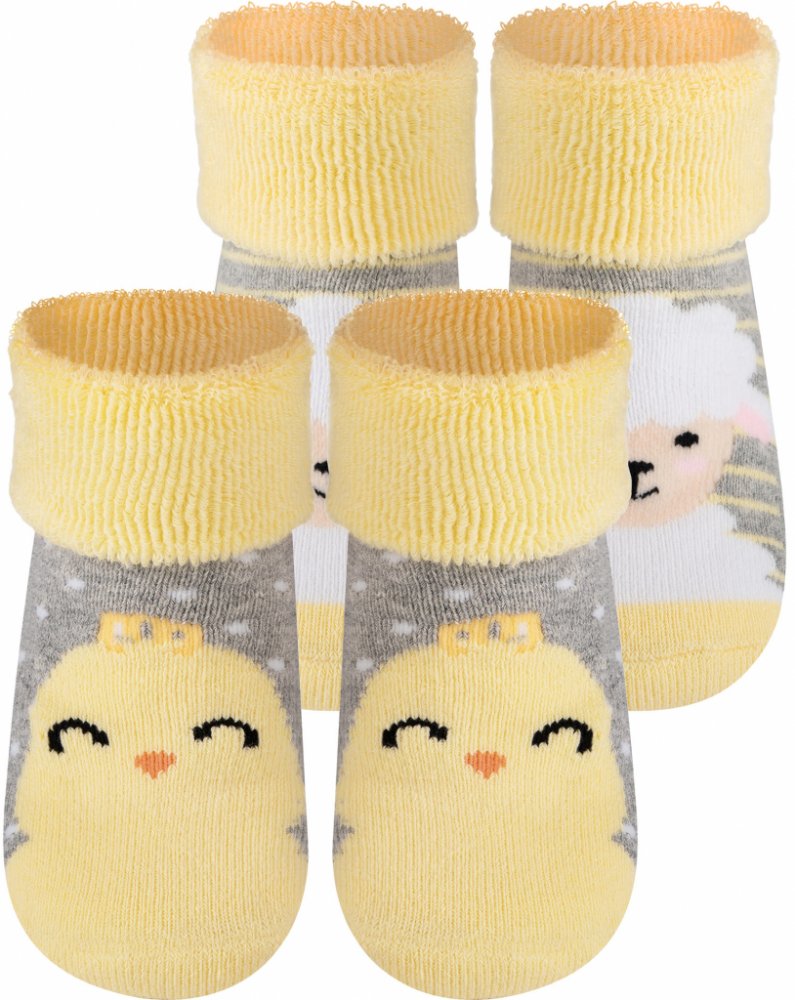 Soxo Dětské ponožky, 2 páry Barevné ponožky ve veselém dárkovém balení Ideální dárek k Velikonocům Protiskluzové silikonové nopky 2 páry Materiál Modrá/šedá; žlutá: 85% bavlna, 14% polyamid, 1% elastan / 86% bavlna, 13% polyamid, 1% elastan Šedá/světle růžová: 87 % bavlna, 13 % polyamid, 1 % elastan Velikost 16/18 – 19/21
