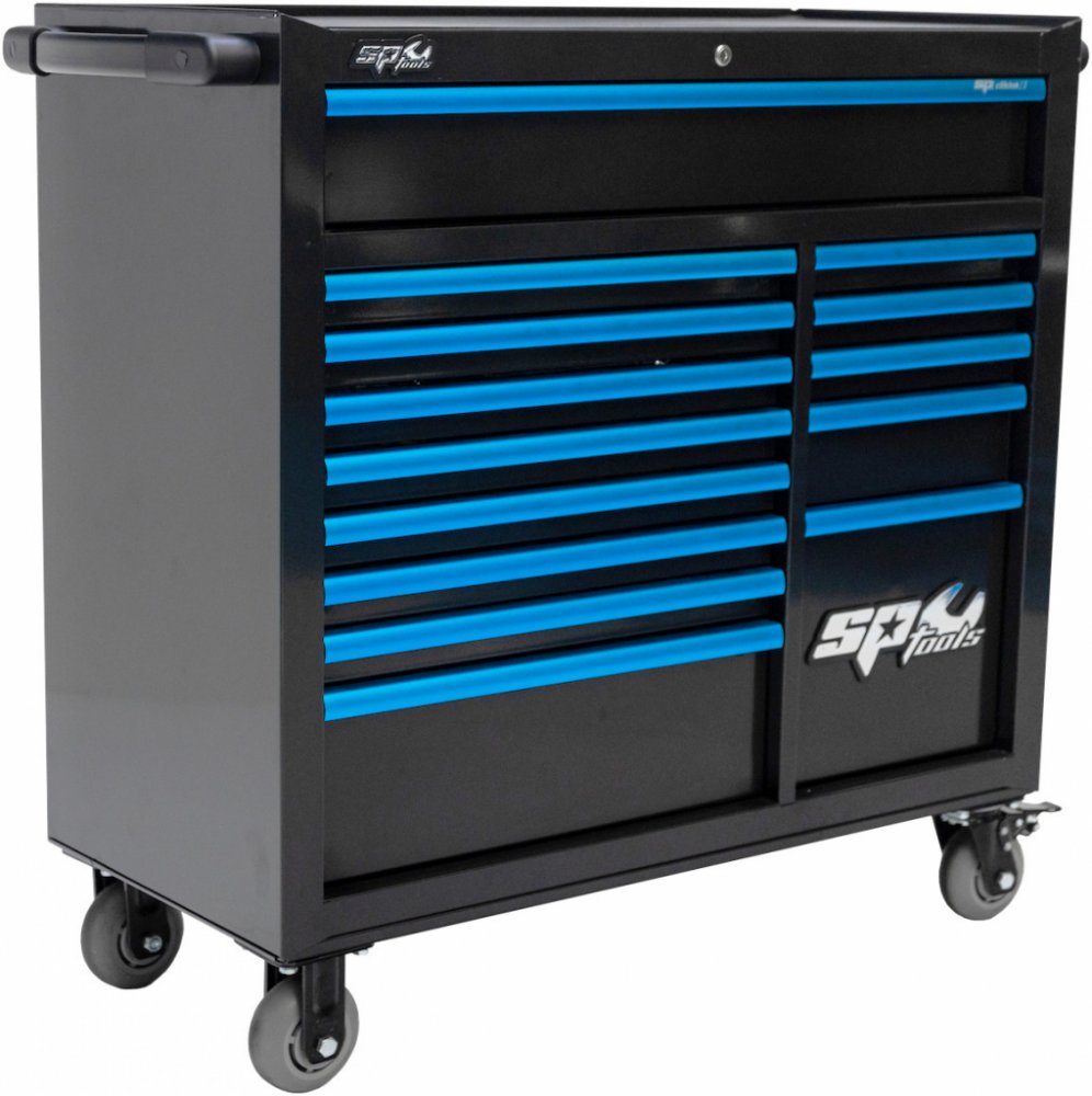 Celokovový uzamykatelný Dílenský box SPT CUSTOM – černý SP40628 se čtrnácti zásuvkami na kuličkových ložiscích. Pojezdy zásuvek jsou navrženy s nosností 40 kg na nízkou zásuvku a až 80 kg na vysokou zásuvku.