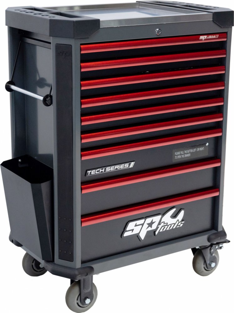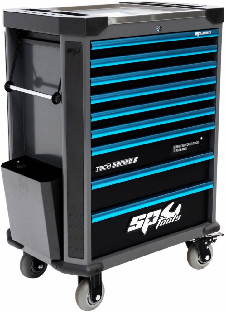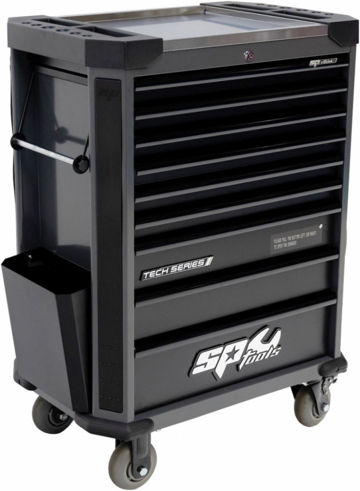 Celokovový uzamykatelný Dílenský box SPT TECH - černý SP42265 s devíti zásuvkami na kuličkových ložiscích. Pojezdy zásuvek jsou navrženy s nosností 40 kg na nízkou zásuvku a až 80 kg na vysokou zásuvku. Vozíky jsou standardně vybaveny držákem na role papírů, držákem na spreje a integrovaným odpadkovým košem, aby měl zákazník vše pohodlně na dosah ruky.