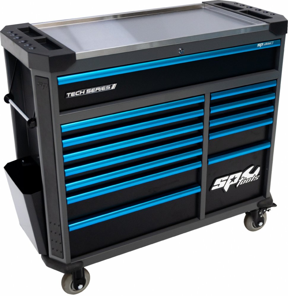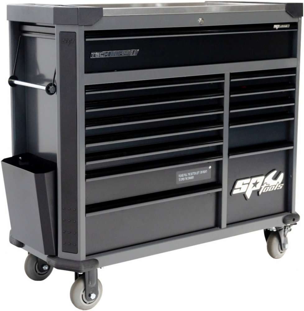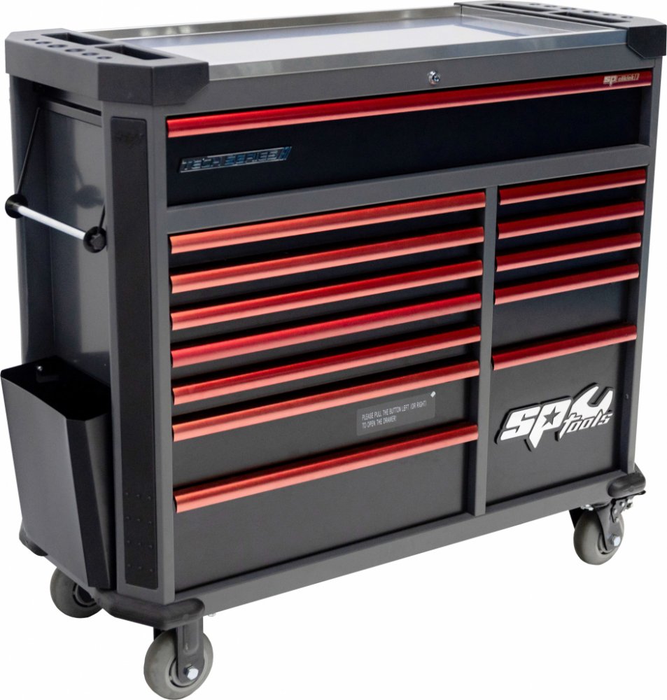 Celokovový uzamykatelný Dílenský box SPT TECH XL - červený SP42355 se třinácti zásuvkami na kuličkových ložiscích. Pojezdy zásuvek jsou navrženy s nosností 40 kg na nízkou zásuvku a až 80 kg na vysokou zásuvku. Vozíky jsou standardně vybaveny držákem na role papírů, držákem na spreje a integrovaným odpadkovým košem, aby měl zákazník vše pohodlně na dosah ruky.
