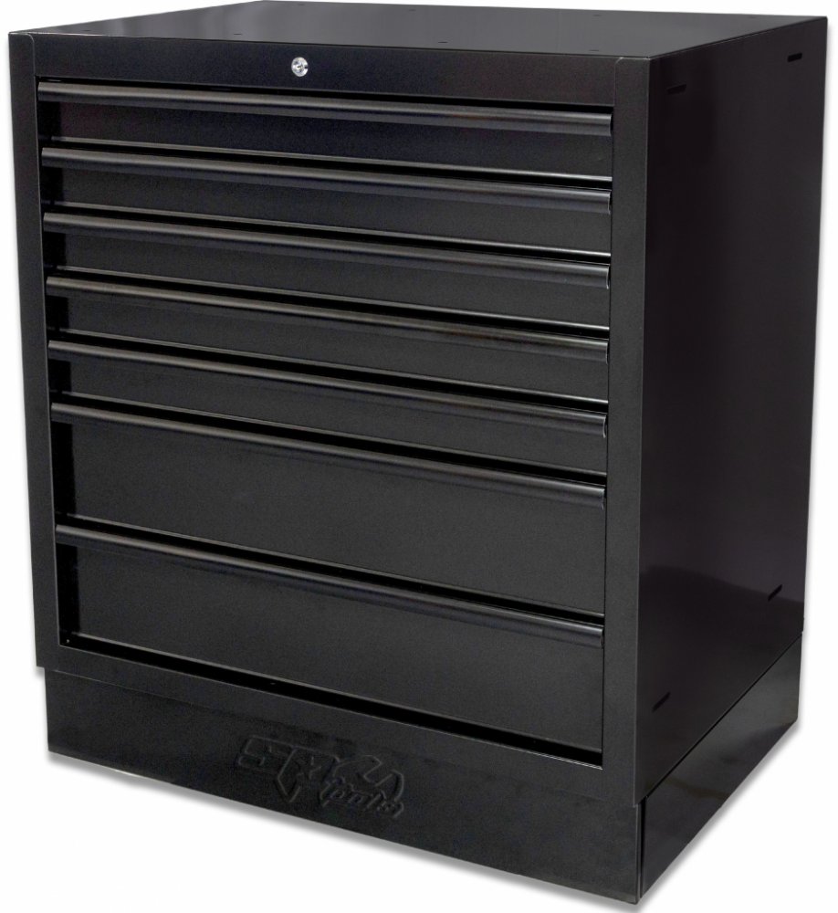 Celokovová uzamykatelná Dílenská skříňka SPT USA - 7 zásuvek SP45557. Pojezdy zásuvek jsou navrženy s nosností 60 kg na nízkou zásuvku a až 120 kg na vysokou zásuvku. Zásuvky jsou vybavené protiskluzovou pěnovou podložkou pohlcující zvuk.