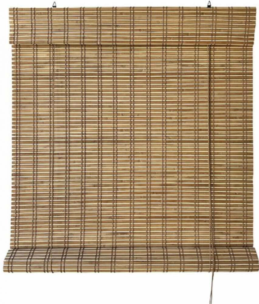 Bambusová rolovací roleta se šňůrovým ovládáním, včetně brzdičky, montážních háčků a prvku na omotání šňůry.