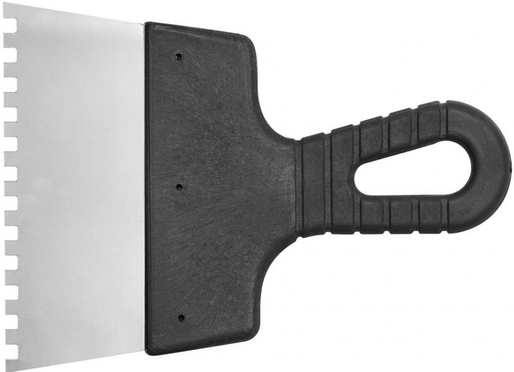 Široká zubatá pružná špachtle z nerezového materiálu s plastovou rukojetí, pro roztírání stavebních lepících hmot.
