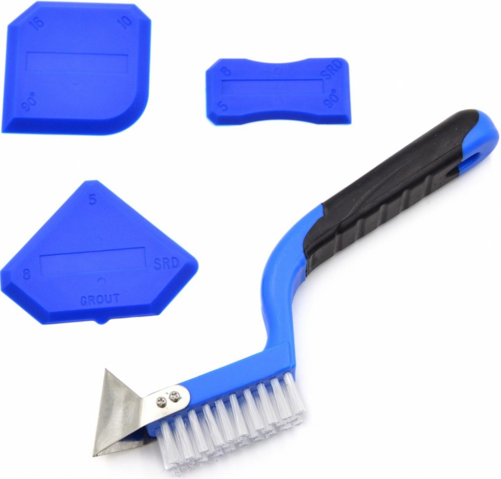 Stěrky na silikon s kartáčkemSada tří stěrek z termoplastické pryže (TPR) pro nanášení a vyhlazování čerstvé silikonové a akrylové hmoty. Stěrky mají různý tvar odpovídající různým šířkám spár a různým úhlům spojů. Kartáček s tvrdými nylonovými štětinami umožňuje čištění a odstranění starého materiálu. Dále je vybaven kovovou škrabkou na odstranění tvrdých úlomků materiálu.