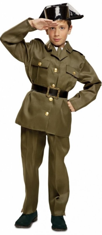 Tmavozelený žaket s dlouhým rukávem má na hrudníku dvě kapsy zdobené zlatými knoflíky. Stejné knoflíky slouží jako zapínání. Součástí kostýmu jsou také tmavozelené kalhoty, černý pásek se zlatou sponou a černý klobouk. Límec je zdoben dvěma odznaky.