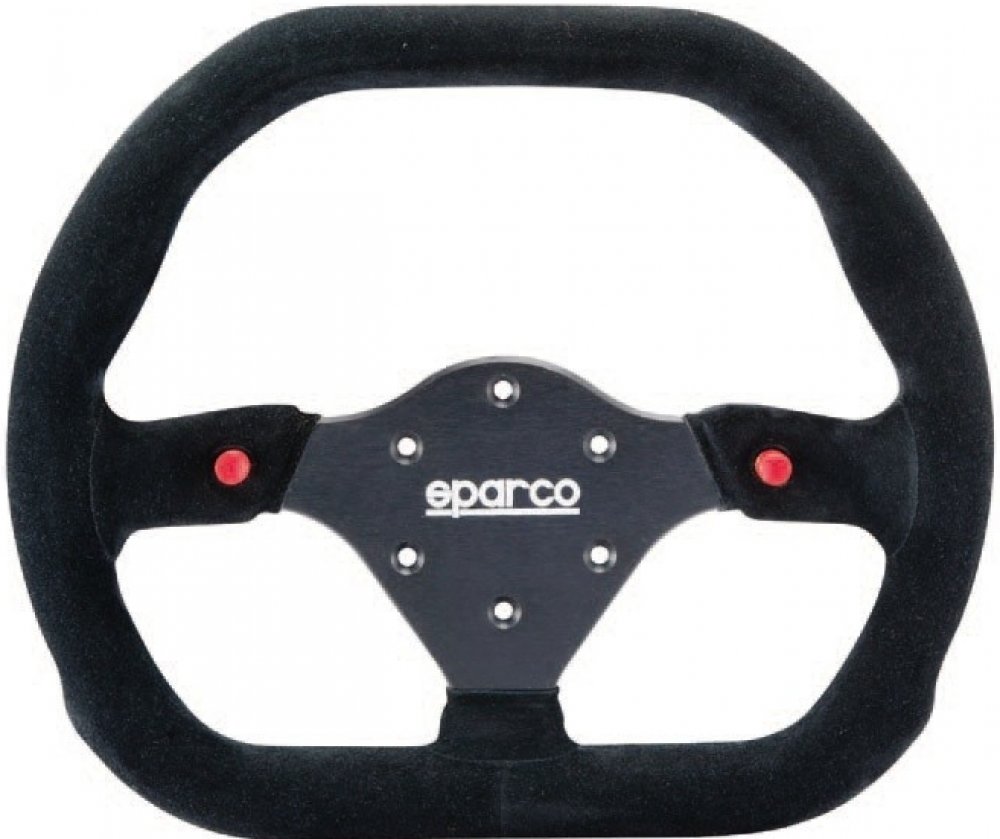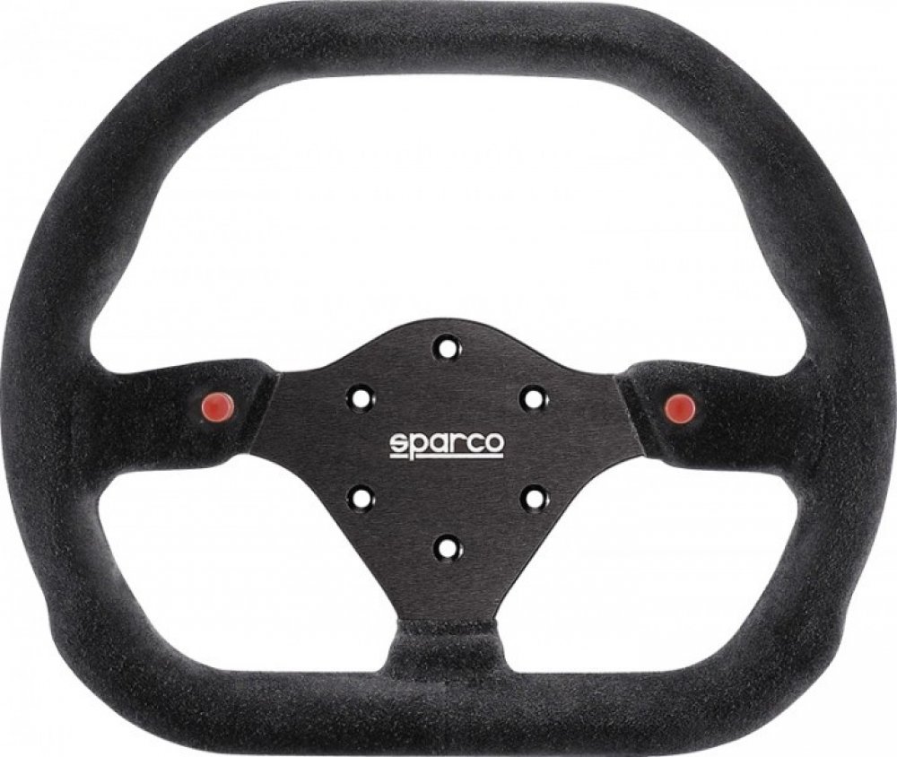 Závodní semišový volant Sparco P310 se zploštělou horní a spodní částí (výška volantu 260mm). Volant je osazen 2ks tlačítek.