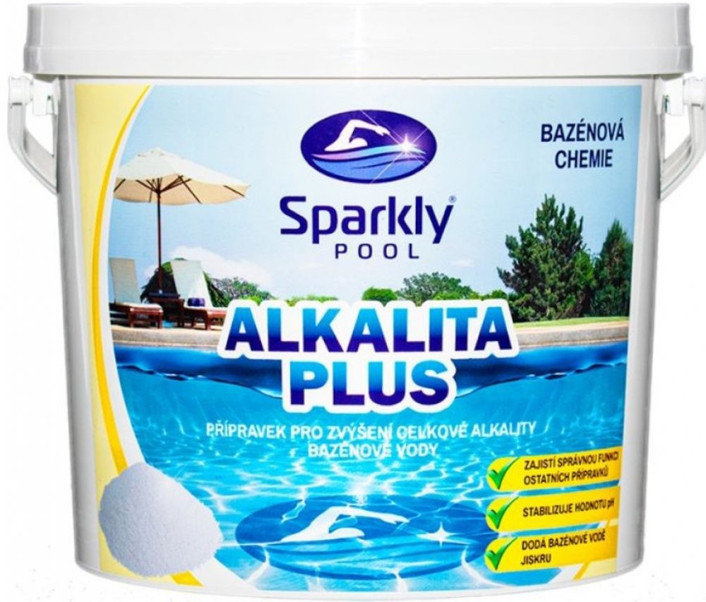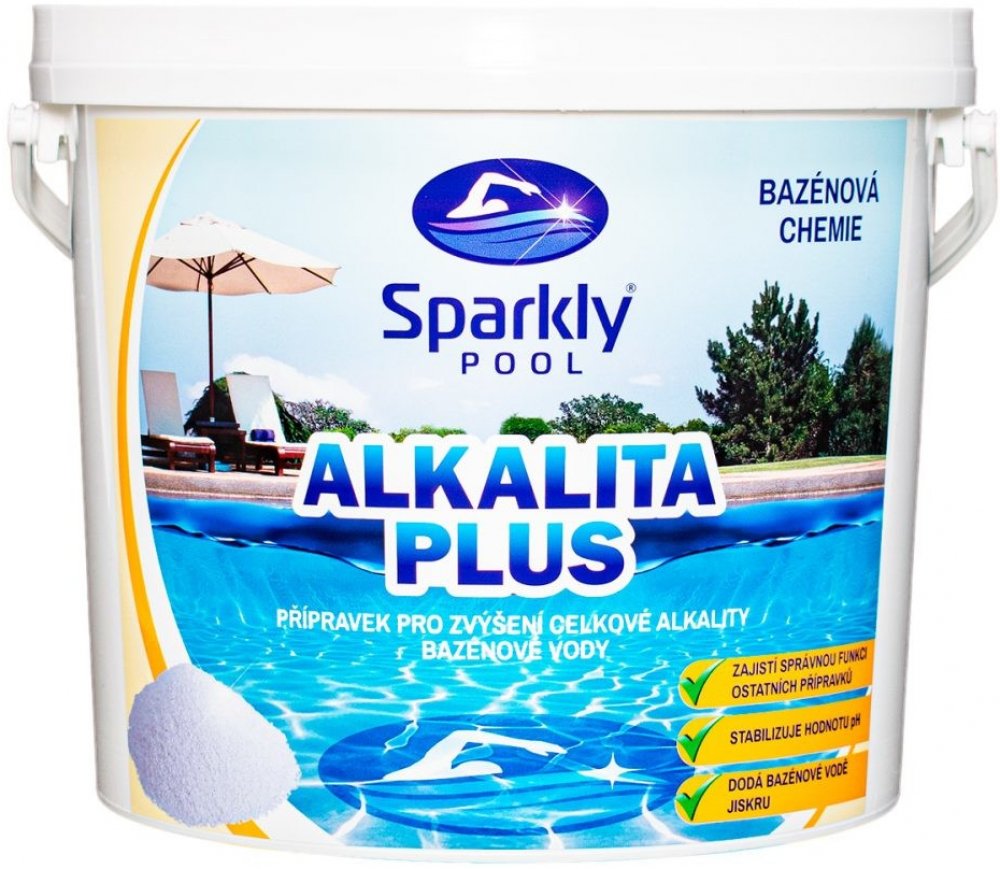 Alkalita plus Sparkly POOL je bezchlorový přípravek, který použijeme v případě, kdy je nízká celková alkalita a je nutné alkalitu upravit, tedy zvýšit alkalitu vody v bazénu. Alkalita plus granulát Sparkly POOL je určený do bazénu se sladkou i slanou vodou a také do vířivky. Díky tomuto přípravku bude úprava, zvýšení alkality vody v bazénu jednoduché a bezpečné. Tento přípravek je vhodný do všech typů bazénů, při používání chlorové i bezchlorové chemie. Správná celková alkalita bazénové vody zajistí správnou funkci všech ostatních používaných přípravků, zamezí kolísání pH vody a dodává vodě jiskru. Bazénová chemie Sparkly POOL řeší každý problém s bazénovou vodou. ALKALITA PLUS, je beze zbytku rychlorozpustný přípravek ve formě prášku určený k zvýšení celkové alkality a stabilizaci hodnoty pH vody v bazénu se slanou i sladkou vodou, při používání bezchlorové i chlorové chemie např. bazénové tablety, vhodný do všech typů bazénů. Vaše bazénová voda může být vyčpělá, to znamená, že se hodnota alkality nenachází ve správném rozmezí 80 - 120 ppm. Tímto přípravkem zajistíte správnou hodnotu alkality a zabráníte tím náhlým změnám (kolísání) hodnoty pH. Tento přípravek také optimalizuje účinek všech přípravků k ošetřování bazénové vody a učiní ji jiskrnou. Hodnotu alkality vždy upravte před tím, než změříte a upravíte hodnotu pH a hodnoty ostatních používaných přípravků. DÁVKOVÁNÍ: Pro zvýšení hodnoty celkové alkality vody o 10 ppm použijte na každý 1 m3 (1000 l) objemu vody v bazénu 18 g tohoto přípravku. Dávkování je orientační, přesné dávkování je závislé na provozních podmínkách bazénu. Používejte tento přípravek bezpečně. Před použitím si vždy přečtěte údaje na obalu. PARAMETRY PRODUKTU Balení - hmotnost/obsah 3 kg Forma přípravku granulát Možnosti využití zvýšení celkové alkality v bazénové vodě, stabilizace pH UPOZORNĚNÍ:Pozor! Nemíchejte a nepoužívejte společně s jinými výrobky, zejména se silnými oxidačními činidly a silnými kyselinami. Přípravek smí být použit pouze k úpravě vody v bazénech. Výrobce neručí za škody způsobené nesprávným použitím přípravku. POPIS PRVNÍ POMOCI:PŘI VDECHNUTÍ:Přerušit expozici, dopravit postiženého na čerstvý vzduch. Při přetrvávající nevolnosti zajistěte lékařskou pomoc. PŘI STYKU S KŮŽÍ:Odstranit kontaminovaný oděv, boty a důkladně omýt vodou (nejlépe vlažnou) a mýdlem. Nepoužívat rozpouštědla ani ředidla. Pokud potíže přetrvávají, vyhledat lékařskou pomoc. PŘI STYKU S OKEM:Vyplachovat mírným proudem vody alespoň 15 minut. Držte přitom oční víčka široce otevřená pomocí palce a ukazováčku. V případě, že postižený nosí kontaktní čočky, vyjměte je před vyplachováním očí, jde-li to snadno. Pokud bolest nebo zčervenání přetrvává, vyhledejte odborné lékařské ošetření. PŘI POŽITÍ:Vyplachujte ústa a dejte vypít velké množství vody. Nevyvolávejte zvracení. Nepodávejte mléko ani alkoholické nápoje. Osobám v bezvědomí nikdy nepodávejte nic ústy. Vyhledejte lékařskou pomoc. LIKVIDACE:Odstranit dle platných českých a místních předpisů (např. ve spalovně nebezpečných odpadů). Nikdy neodstraňujte spláchnutím do kanalizace! Neznečistěte stojící nebo tekoucí vody chemikálií nebo použitou nádobou. Zbytková množství a nezregenerované roztoky předejte osvědčené likvidační firmě. Za zatřídění odpadu a jeho odstranění zodpovídá původce odpadu. ÚDAJE O NEBEZPEČNOSTI PŘÍPRAVKU:SIGNÁLNÍ SLOVO:Není. STANDARTNÍ VĚTY O NEBEZPEČNOSTI:Produkt není klasifikován jako nebezpečný podle nařízení ES č. 1272/2008 (CLP). POKYNY PRO BEZPEČNÉ ZACHÁZENÍ:Uchovávejte mimo dosah dětí.