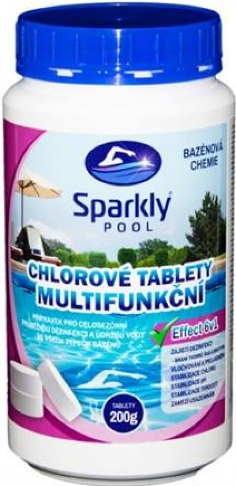 Sparkly Pool Chlorové tablety 6v1 5x200 g 1 kg Chlorové tablety do bazénu 6v1 multifunkční MAXI o hmotnosti 200g je přípravek pro celosezónní průběžnou dezinfekci a údržbu vody ve všech typech bazénů. Tyto pomalurozpustné bazénové tablety 6v1 zajišťují dezinfekci, vločkují, projasňují, stabilizují chlor, pH a tvrdost a zamezují usazeninám. Bazénová chemie Sparkly POOL řeší každý problém s bazénovou vodou. Vysoce účinný beze zbytku pomalurozpustný chlorový multifunkční přípravek ve formě 200 g tablet určený k celosezónní průběžné dezinfekci a údržbě vody