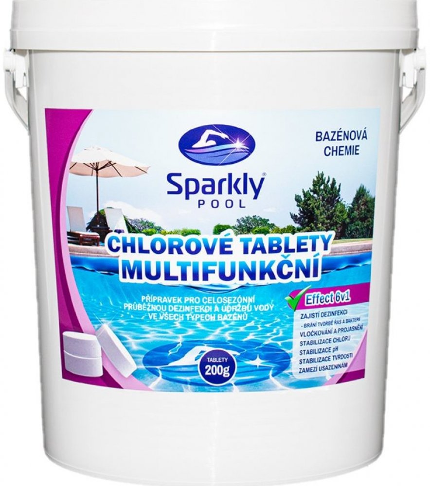 Chlorové tablety do bazénu 6v1 multifunkční MAXI o hmotnosti 200g je přípravek pro celosezónní průběžnou dezinfekci a údržbu vody ve všech typech bazénů. Tyto pomalurozpustné bazénové tablety 6v1 zajišťují dezinfekci, vločkují, projasňují, stabilizují chlor, pH, tvrdost a zamezují usazeninám.