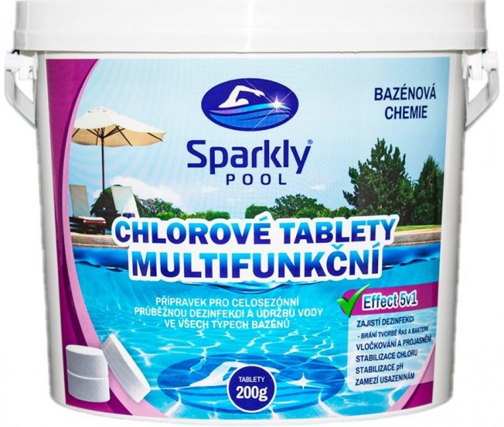 je vysoce účinný beze zbytku pomalurozpustný chlorový multifunkční přípravek ve formě 200 g tablet určený k celosezónní průběžné dezinfekci a údržbě vody ve všech typech bazénů, který působí komplexně a zajišťuje 5 účinků pro zachování vysoké kvality bazénové vody. Zajišťuje DEZINFEKCI, zabraňuje tvorbě řas a bakterií. Díky flokulačnímu účinku VLOČKUJE, PROJASŇUJE a zlepšuje efektivitu filtračního systému, tím udržuje průzračnou a jiskrnou vodu. STABILIZUJE CHLOR a pH, zamezuje VÁPENATÝM USAZENINÁM. Aplikací této 200 g tablety se speciálním složením lze takto ošetřit bazénovou vodu v bazénech o objemu 20 - 30 m3 po dobu 5 - 8 dnů při běžných podmínkách.