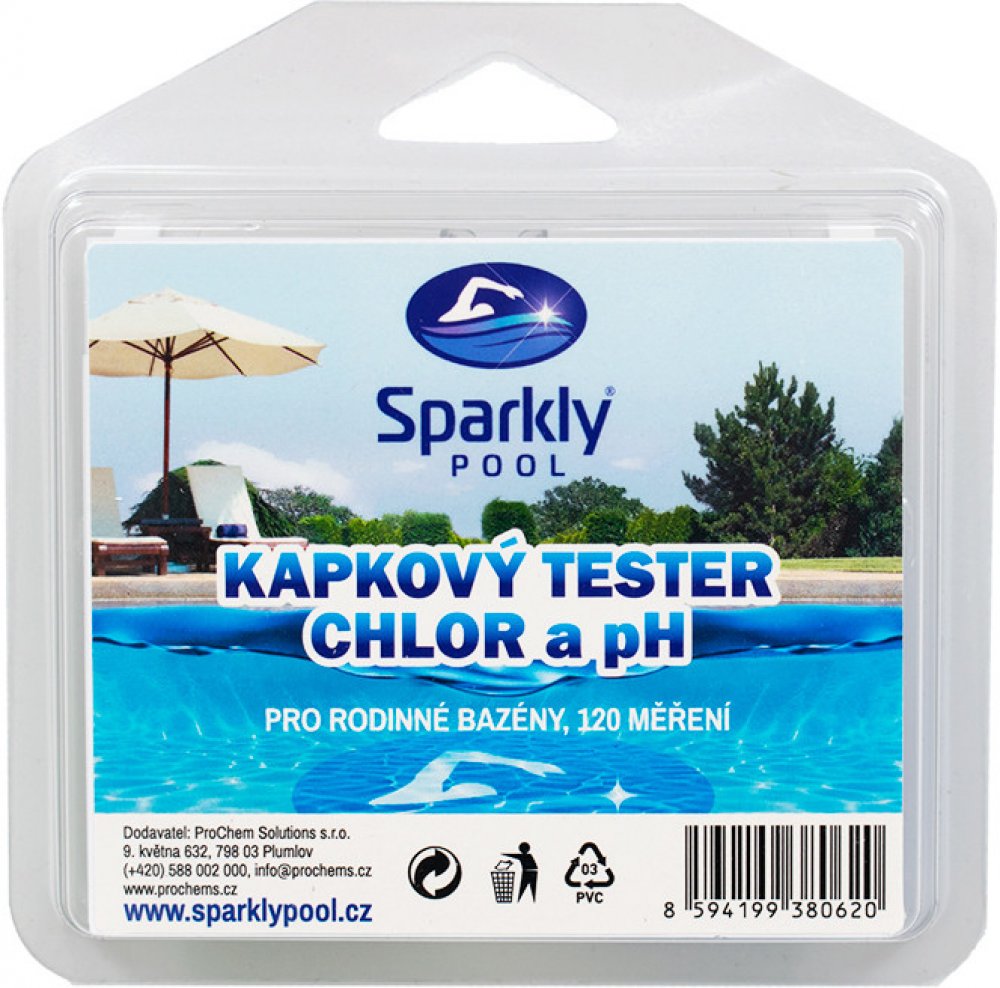 Testerem SPARKLY POOL CL a pH se stanovuje obsah celkového (aktivního) chloru, orientačně lze stanovit i chlor volný. Volný chlor je ten, který po nadávkování zůstal nesloučený. Orientační stanovení je možné provést ihned po přidání činidel bez čekání (reakce s vázaným chlorem je pomalá).Vázaný chlor je ta část aktivního chloru, která se vázala labilně na dusíkaté látky, jako jsou amonné ionty, močovina aj., které pocházejí hlavně z lidské pokožky (potu). Takto vázaný chlor má stále desinfekční účinky vytváří, však zdravotně závadné chloraminy. Při zvýšeném obsahu vázaného chloru (nad 0,3 mg/l) je vhodné „naředit” vodu v bazénu vodou čistou. Vázaný chlor není přímo stanovitelný, jeho obsah se vypočítá z rozdílu – chlor celkový mínus chlor volný. Chlor celkový (aktivní) je součtem chloru volného a vázaného. S testerem SPARKLY POOL se stanovuje s vyčkáním 2 minuty po přidání činidel, aby zreagoval i chlor vázaný.