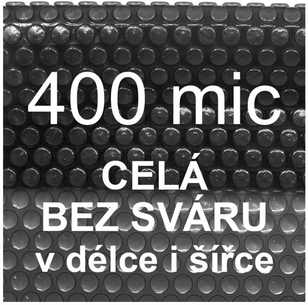 Solární bublinková plachta - fólie na bazén černá o tloušťce 400 mikronů s dlouhodobou UV ochranou a vysokou odolností vůči chemii a slané vodě je dodávaná v rozměrech na míru. Plachta je vyrobena v celé šířce i délce bez sváru (bez svařovaného spoje), proto je na hladině dokonale rovná. Bazénová solární plachta - fólie využívá solární energii k ohřívání vody, brání nočnímu ochlazování a spadnutí nečistot jako je např. listí, pyl, hmyz atd. do bazénu. Tepelný výkon této plachty je díky průměru a šířce bubliny 16mm až o 20% vyšší než u standartních plachet. Černá barva zároveň chrání před tvorbou vodních řas. Solární plachta - na míru, 400 micronů, černá, celá bez sváru Bazénová solární plachta zabrání odpařování vody a úniku bazénové chemie, nahřeje vodu pomocí sluneční energie až o 4°C za den a v noci udrží vodu v bazénu teplou. Solární plachta je vhodná pro venkovní i vnitřní bazény. Tuto plachtu lze objednat v libovolné délce až do 50 m o šířce 3m, 3,5m nebo 4m. Plachta je vyrobena v celé šířce i délce bez sváru (bez svařovaného spoje), proto je na hladině dokonale rovná! Upozornění:Jedná se o zboží vyrobené na zakázku. Dle § 1837 spotřebitel nemůže odstoupit od smlouvy o dodávce zboží, které bylo upraveno podle jeho přání! Parametry solární plachty na míru Rozměr plachty: volitelná šíře 3m, 3,5m a 4m, délka plachty je libovolná do 50m Barva plachty: černá (ohřívá vodu a chrání před tvorbou řas) Materiál: PE bublinková folie 400 mic černá s dlouhodobou UV ochranou Bublinka - typ: kulatý, průměr bublinky 16mm!! Bez sváru, plachta je celistvá bez jakýchkoliv svařovaných spojů Výrobní rozměrová tolerance činí maximálně 0,85% Vhodná do bazénu se sladkou i slanou vodou Vysoká odolnost vůči bazénové chemii Výhody solární plachty Sparkly POOL 400 mic Solární plachta ohřívá vodu v bazénu, udržuje její teplotu a brání ztrátám teploty vody v bazénu v nočních hodinách. Materiál, ze kterého je plachta vyrobena obsahuje UV stabilizaci, která zabraňuje foto degradaci plachty vlivem působení UV spektra slunečního záření. Díky speciálnímu složení materiálu, ze kterého je plachta vyrobena je vysoce odolná vůči působení bazénové chemie i slané vody. Velmi dlouhá životnost. Chrání bazén proti spadu nečistot. BARVA PLACHTY: díky černé barvě neprostoupí sluneční paprsky skrz plachtu do vody, tím plachta vytváří stínící efekt, který zabraňuje fotosyntéze a tím zamezí růstu vodních řas. Sluneční paprsky nahřívají plachtu pouze na povrchu a tím ohřáté bublinky předávají teplo do vody v bazénu. Ohřev je tedy o něco málo nižší než u plachet transparentních světlých barev. Naše plachta Sparkly POOL má průměr bublinky 16mm, zajistí tak rychlejší ohřev vody o 20% oproti standartnímu průměru bublinky (12mm). Nemá svár, je vyrobena v celé šířce bez svařovaného spoje, proto je na hladině dokonale rovná. Pokud potřebujete upravit tvar plachty podle bazénu, pak položte plachtu bublinkami dolů na vodní hladinu, transportní sklady na plachtě se za několik hodin srovnají a následně je možné vytvarovat plachtu zalamovacím nožem. Jak používat solární plachtu Plachtu pokládejte do bazénu bublinkami dolů, tedy do vody tak, aby plachta plavala na vodní hladině. Nenechávejte solární plachtu mimo vodní hladinu na přímém slunci, mohlo by dojít k deformaci materiálu, ze kterého je plachta vyrobena. Po ukončení sezóny plachtu vysušte a uschovejte na suché místo mimo dosah těkavých látek, jako je např. benzin, ředidlo, barvy.
