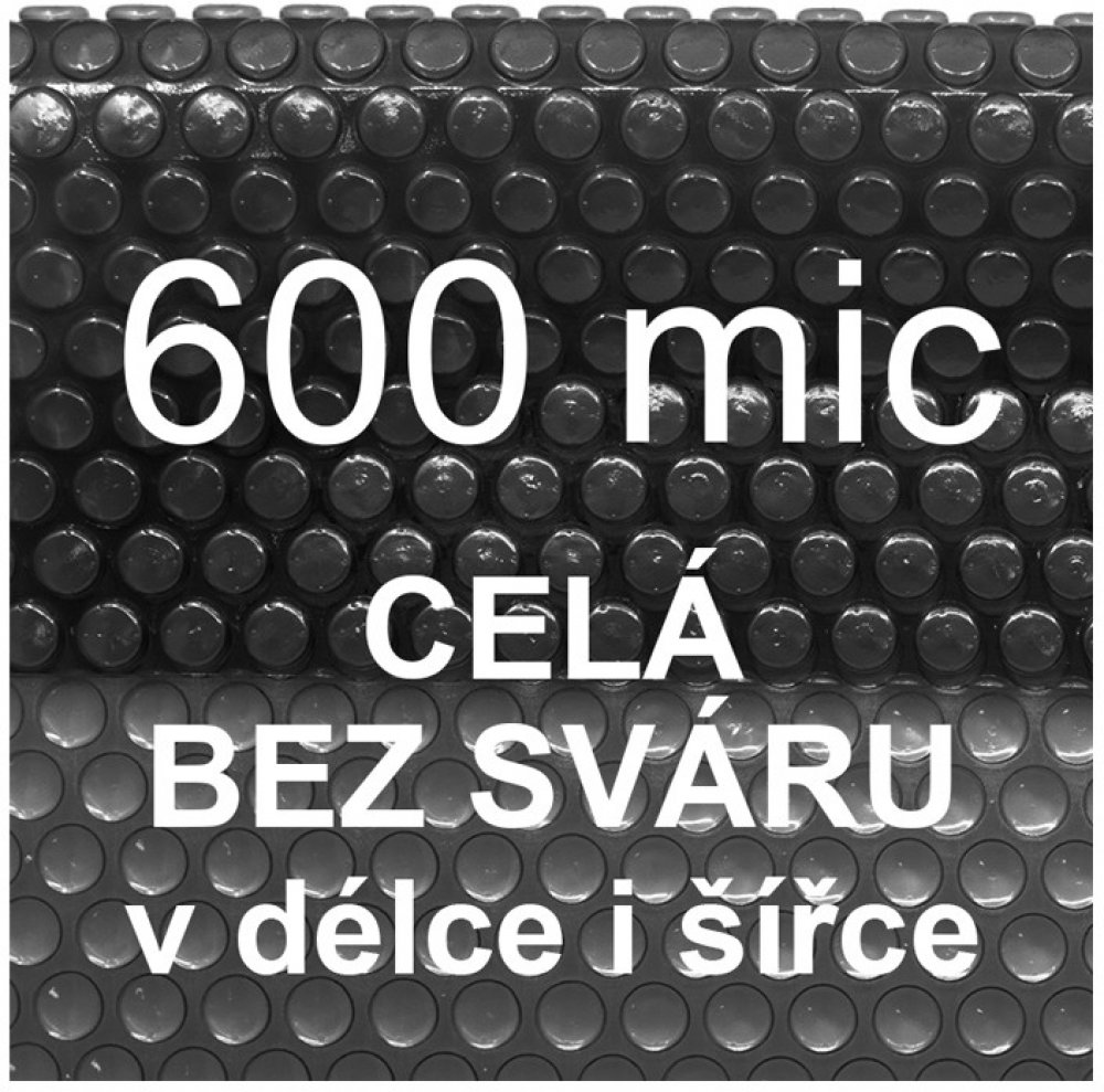 Solární bublinková plachta - fólie na bazén černá o tloušťce 600 mikronů s dlouhodobou UV ochranou a vysokou odolností vůči chemii a slané vodě je dodávaná v rozměrech na míru. Plachta je vyrobena v celé šířce i délce bez sváru (bez svařovaného spoje), proto je na hladině dokonale rovná. Bazénová solární plachta - fólie využívá solární energii k ohřívání vody, brání nočnímu ochlazování a spadnutí nečistot jako je např. listí, pyl, hmyz atd. do bazénu. Tepelný výkon této plachty je díky průměru a šířce bubliny 16mm až o 20% vyšší než u standartních plachet. Černá barva zároveň chrání před tvorbou vodních řas. Solární plachta - na míru, 600 micronů, černá, celá bez sváru Bazénová solární plachta zabrání odpařování vody a úniku bazénové chemie, nahřeje vodu pomocí sluneční energie až o 4°C za den a v noci udrží vodu v bazénu teplou. Solární plachta je vhodná pro venkovní i vnitřní bazény. Tuto plachtu lze objednat v libovolné délce až do 50 m o šířce 3m, 3,5m nebo 4m. Plachta je vyrobena v celé šířce i délce bez sváru (bez svařovaného spoje), proto je na hladině dokonale rovná! Upozornění:Jedná se o zboží vyrobené na zakázku. Dle § 1837 spotřebitel nemůže odstoupit od smlouvy o dodávce zboží, které bylo upraveno podle jeho přání! Parametry solární plachty na míru Rozměr plachty: volitelná šíře 3m, 3,5m a 4m, délka plachty je libovolná do 50m Barva plachty: černá (ohřívá vodu a chrání před tvorbou řas) Materiál: PE bublinková folie 600 mic černá s dlouhodobou UV ochranou Bublinka - typ: kulatý, průměr bublinky 16mm!! Bez sváru, plachta je celistvá bez jakýchkoliv svařovaných spojů Výrobní rozměrová tolerance činí maximálně 0,85% Vhodná do bazénu se sladkou i slanou vodou Vysoká odolnost vůči bazénové chemii Výhody solární plachty Sparkly POOL 600 mic Solární plachta ohřívá vodu v bazénu, udržuje její teplotu a brání ztrátám teploty vody v bazénu v nočních hodinách. Materiál, ze kterého je plachta vyrobena obsahuje UV stabilizaci, která zabraňuje foto degradaci plachty vlivem působení UV spektra slunečního záření. Díky speciálnímu složení materiálu, ze kterého je plachta vyrobena je vysoce odolná vůči působení bazénové chemie i slané vody. Velmi dlouhá životnost. Chrání bazén proti spadu nečistot. BARVA PLACHTY: díky černé barvě neprostoupí sluneční paprsky skrz plachtu do vody, tím plachta vytváří stínící efekt, který zabraňuje fotosyntéze a tím zamezí růstu vodních řas. Sluneční paprsky nahřívají plachtu pouze na povrchu a tím ohřáté bublinky předávají teplo do vody v bazénu. Ohřev je tedy o něco málo nižší než u plachet transparentních světlých barev. Naše plachta Sparkly POOL má průměr bublinky 16mm, zajistí tak rychlejší ohřev vody o 20% oproti standartnímu průměru bublinky (12mm). Nemá svár, je vyrobena v celé šířce bez svařovaného spoje, proto je na hladině dokonale rovná. Pokud potřebujete upravit tvar plachty podle bazénu, pak položte plachtu bublinkami dolů na vodní hladinu, transportní sklady na plachtě se za několik hodin srovnají a následně je možné vytvarovat plachtu zalamovacím nožem. Jak používat solární plachtu Plachtu pokládejte do bazénu bublinkami dolů, tedy do vody tak, aby plachta plavala na vodní hladině. Nenechávejte solární plachtu mimo vodní hladinu na přímém slunci, mohlo by dojít k deformaci materiálu, ze kterého je plachta vyrobena. Po ukončení sezóny plachtu vysušte a uschovejte na suché místo mimo dosah těkavých látek, jako je např. benzin, ředidlo, barvy.