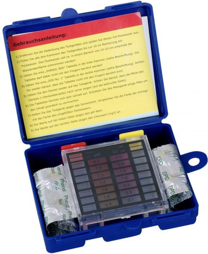 Tester bazénové vody - chlor a pH classic, tabletový.Tento bazénový tester vody v bazénu umožňuje 10 měření, testování bazénové vody na koncentraci celkového i volného chloru a 10 měření, testování pH vody v bazénu. Náhradní tablety do testeru na měření chloru i pH lze dokoupit zvlášť. Bazénový tabletový tester classic pro pH a chlor Bazénový tester pro měření pH a chloru v bazénové vodě. Balení testeru obsahuje: Jednokomorový plastový tester pH/Cl Tablety na měření chloru - 10 kusů tablet Tablety na měření pH - 10 kusů tablet Rozsah měření: Chlor: 0,1 – 3 mg/l pH: 6,8 – 8,2