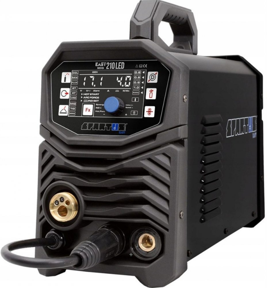 SPARTUS® EasyMIG210LED je vybaven synergickými programy pro svařování metodou MIG / MAG s ocelovými dráty v rozsahu průměrů 0,6 / 0,8 / 1,0 mm. Kromě toho má stroj možnost ručního nastavení parametrů. Ostatní parametry nastaví zařízení automaticky.