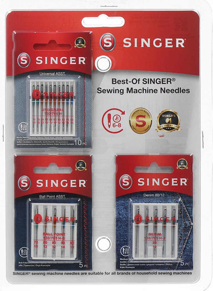 Metallic (pro metalické nitě - bez barevného označení), Quilting (pro quiltování - fialové označení), Universal (universální na všechny tkaniny - červené označení), Overlock 14SH (pro overlocky - bez barevného označení), Microtex (pro mikrovlákno, hedvábí - černé označení), Jeans (pro džínovinu - modré označení), Leather (pro kůži a koženku - hnědé označení), Hemstitch (pro obrubování - bez barevného označení), Embroidery (pro vyšívací stroje - bílé označení), Stretch (pro pleteniny - žluté označení, Overlock 14U (pro overlocky - bez označení).