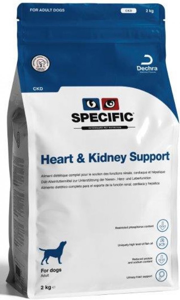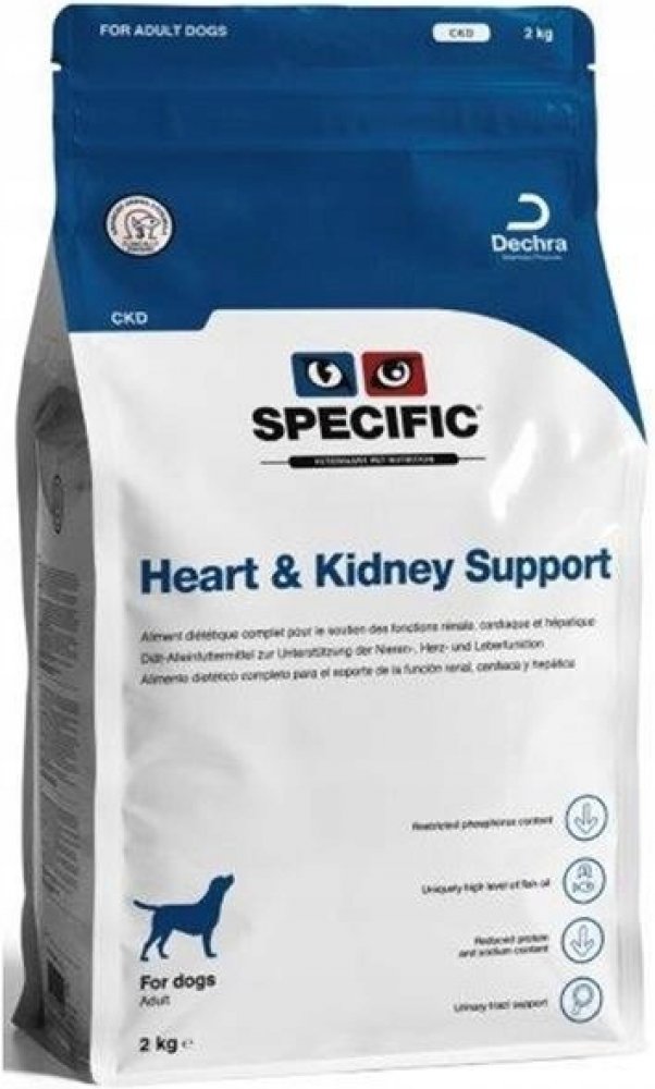 SPECIFIC® Heart & Kidney Support je kompletní dietní krmivo pro podporu funkce ledvin, srdce a jater u dospělých psů trpících chronickou ledvinovou, srdeční a/nebo jaterní nedostatečností. Tato dieta má nízký obsah fosforu a sodíku a omezený obsah proteinů s vysokou kvalitou a stravitelností. Má vysoký obsah esenciálních mastných kyselin (včetně omega-3 mastných kyselin z rybího oleje) a schopnost...