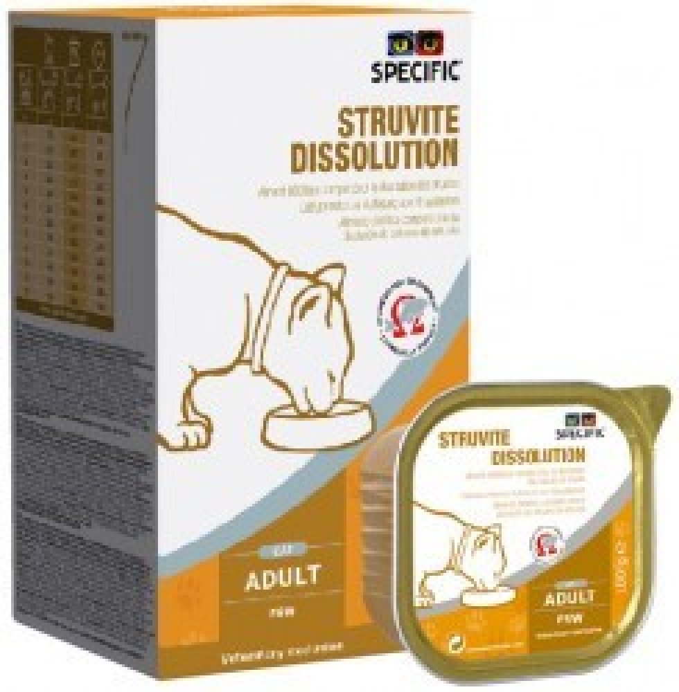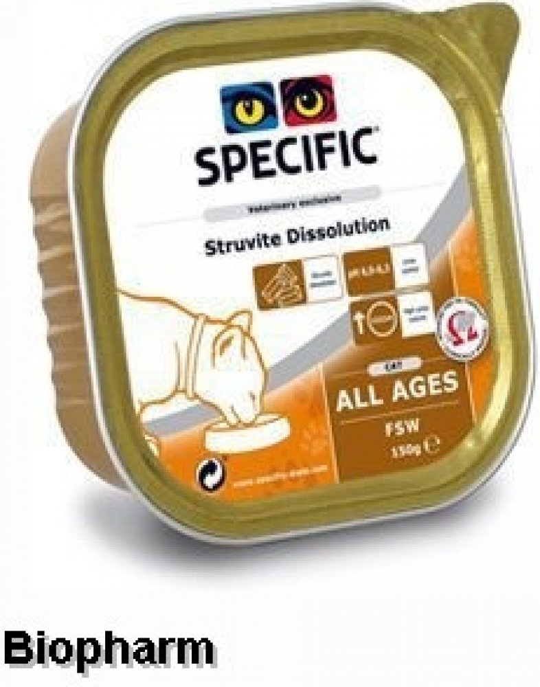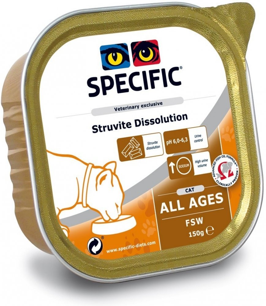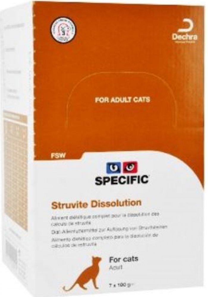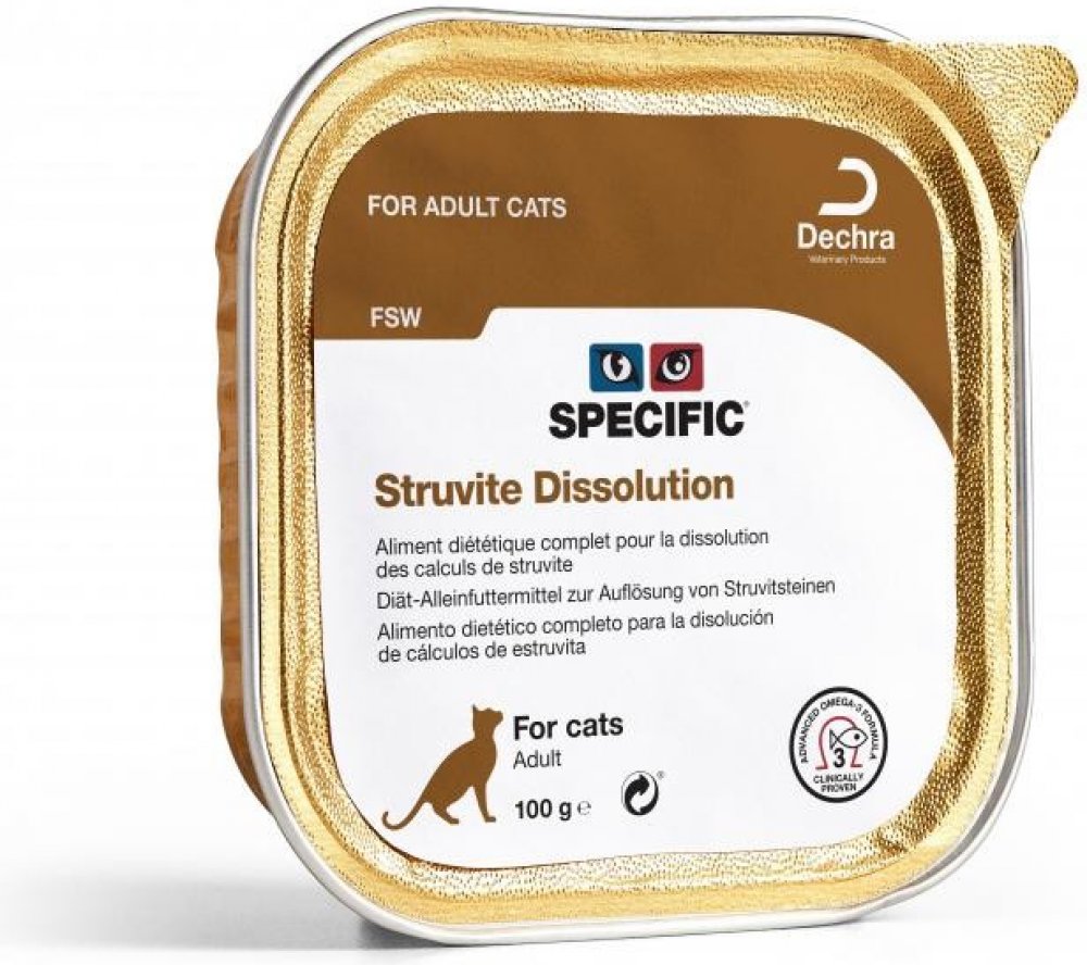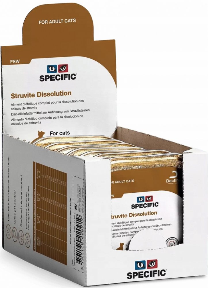 Při rozdělení celkové denní krmné dávky SPECIFIC™ FSW Struvite Dissolution na 3 – 4 porce za den je minimalizována možnost postprandiálního zvýšení pH moči. Po rozpuštění struvitových urolitů (obvykle za 1-2 měsíce) může být zvíře převedeno na SPECIFIC™ FCD/FCW Crystal Prevention nebo SPECIFIC™ FCD-L Crystal Prevention Light, aby se předešlo rekurenci. Pokud má kočka tendenci k rekurentní tvorbě struvitů, je pro ni vhodnější konzervované krmivo, protože s ním přijme více vody, zvýší se diuréza a tím se sníží koncentrace minerálních látek v moči. Ačkoli je struvitová urolitiáza (s hlavními složkami: hořčík, dusík, fosfor) častým typem urolitiázy u koček, nelze předpokládat, že je příčinou všech případů urolitiáz. Přesná identifikace jednotlivých urolitů je nezbytná, a to také pro správnou volbu diety, protože různé typy urolitů = různé typy diet.