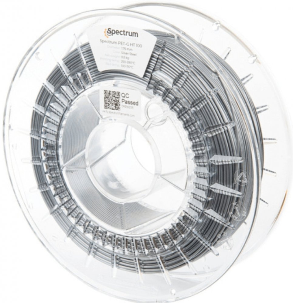 Filament Spectrum je zhotoven z PETG materiálu, který je vysoce odolný. Jeho barva je stříbrná. Má průměr 1,75 mm s tolerancí 0,03 mm, což odpovídá standardní přesnosti pro nároky hobby a poloprofesionálního použití, je tedy vhodný pro většinu tiskových aplikací. Délka návinu činí 176,26 m. Nejlepších výsledků dosahuje při maximální teplotě trysky do 280 °C. Maximální teplota, které může podložka dosahovat, je 110 °C. Je charakteristický střední pružností, která nabízí příjemnou rovnováhu mezi pevností a ohebností. Ideální rychlost tisku je v rozmezí 30 až 150 mm/s. Klíčové vlastnosti produktu Filament Spectrum PET-G HT100 1.75mm Silver Steel 0.5kg Filament Spectrum je vyroben z PETG materiálu Stříbrná barva Průměr 1,75 mm s tolerancí 0,03 mm Délka návinu 176,26 m Optimalizovaný pro tisk při max. teplotě trysky do 280 °C Navržen pro tisk při max. teplotě podložky 110 °C Vyznačuje se střední mírou pružnosti Rychlost tisku se doporučuje mezi 30 a 150 mm/s Doporučená podložka: texturovaná, saténová a PEI...
