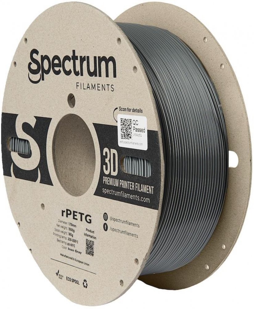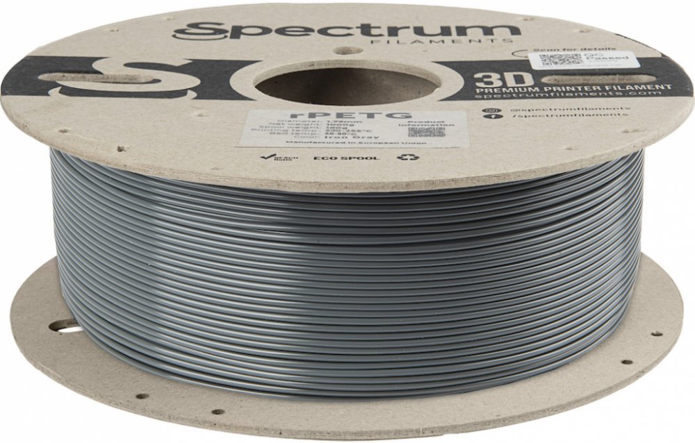 Spectrum r-PETG je ekologický materiál pro 3D tisk, který zapadá do iniciativy udržitelnosti. Vlákno se vyrábí opětovným využitím recyklovaného zbytkového odpadu z vytlačování. Suroviny se sbírají, drtí, znovu míchají a homogenizují na špičkové a snadno tisknutelné recyklované PETG vlákno s mnohem nižším dopadem na životní prostředí. Spectrum r-PETG si zachovává vlastnosti klasického PETG, tj. jednoduchost a účinnost tisku, při velmi nízkém smrštění a relativně vysoké pevnosti v tahu. Aby byl 3D tisk udržitelnější, je Spectrum r-PETG navinuto na ekologické kartonové cívce.
