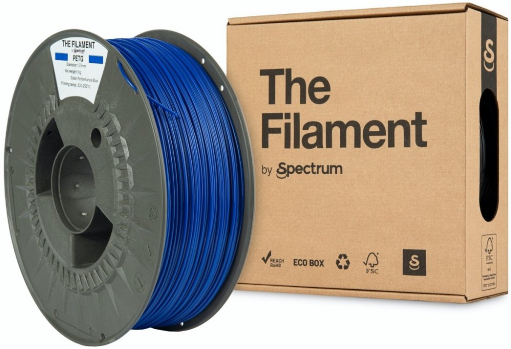 Filament Spectrum je zhotoven z vysoce odolného PETG materiálu. Jeho barva je modrá. Má průměr 1,75 mm s tolerancí 0,03 mm, to odpovídá standardní přesnosti pro hobby i profesionální použití, hodí se tedy pro většinu tiskových projektů. Délka návinu je 32,753 m. Nejlepších výsledků dosahuje při maximální teplotě trysky do 255 °C. Maximální teplota, které může podložka dosahovat, je 75 °C. Vyznačuj...