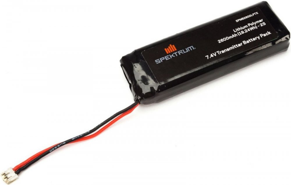 LiPol baterie 7.4 V 2600 mAh pro vysílač Spektrum DX18. Baterie má v sobě zabudovaný integrovaný balancér, který zamezuje přebití článků baterie.