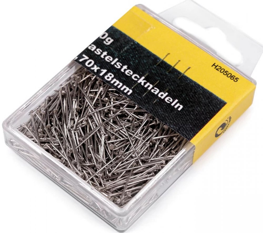 Popis zbožíCelokovové špendlíky využijete převážně na nešitý patchwork a k aranžování. Jsou balené v plastové krabičce.Délka: 18 mmPrůměr drátu: 0,7 mmPrůměr hlavičky: 1,6 - 1,8 mmObsah balení: cca 870 ksHmotnost: 68 g