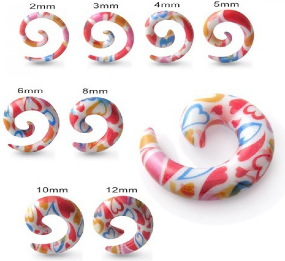Piercing do ucha, bílá spirála se srdci a obrysy srdcí různých barev.