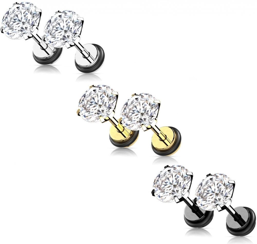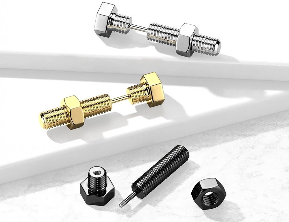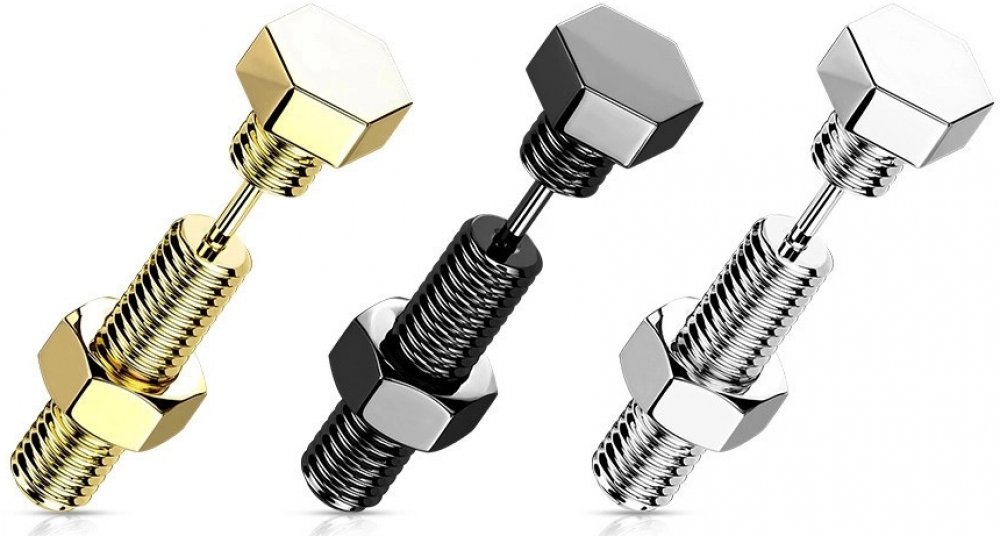 Falešný plug do ucha z chirurgické oceli se skládá ze tří částí. Skládá se z rovného šroubu se šestihrannou hlavou, kulatého těla se závitem, který je v jedné části nahrazen rovným čepem. Na těle šroubu je šestihranná matice. Povrch piercingu je upraven technologií PVD. Různá barevná provedení.