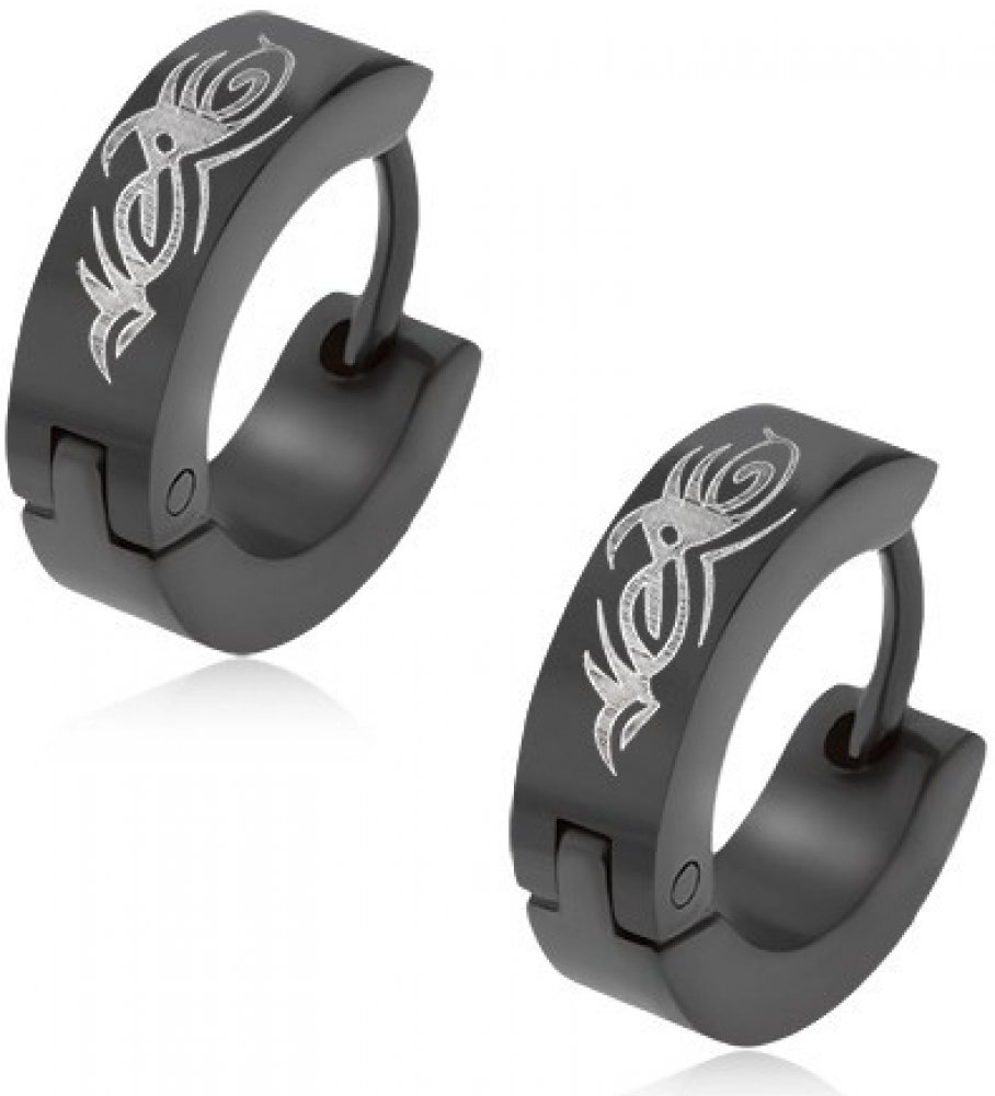 Šperky eshop ocelové náušnice lesklé černé kruhy stříbrný ornament S51.24