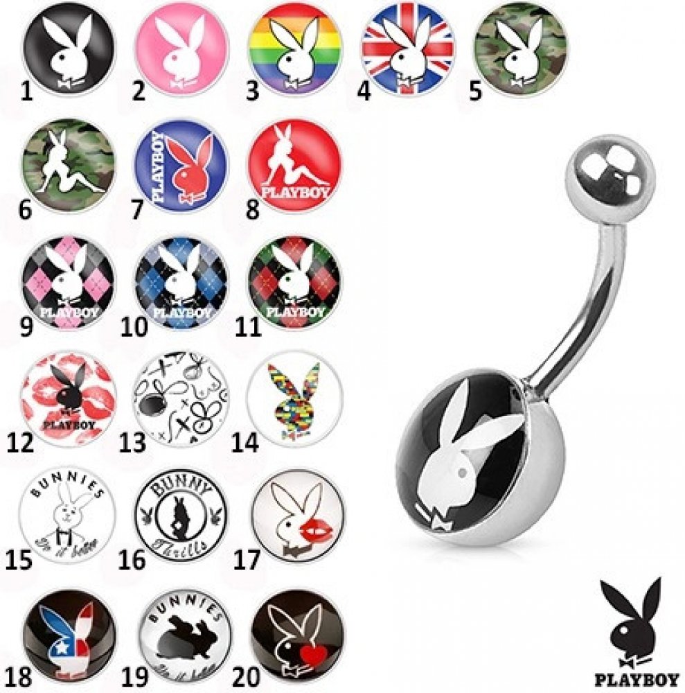 Piercing do pupíku z chirurgické oceli, barevné obrázky s motivy Playboy, glazura.