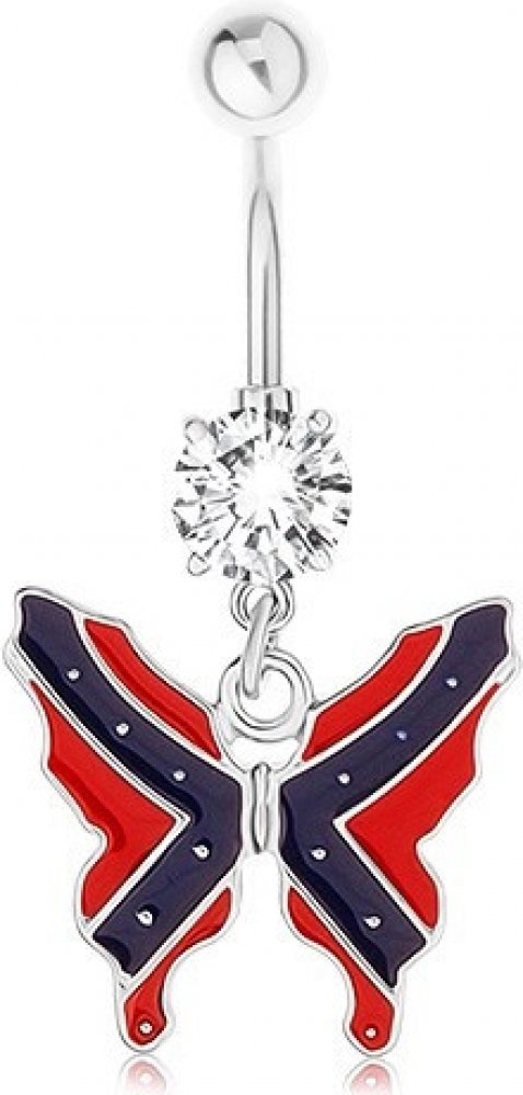 Piercing do pupíku stříbrné barvy, ocel 316L, motýlek s motivem jižanské vlajky, modré překřížené pruhy na červeném pozadí.