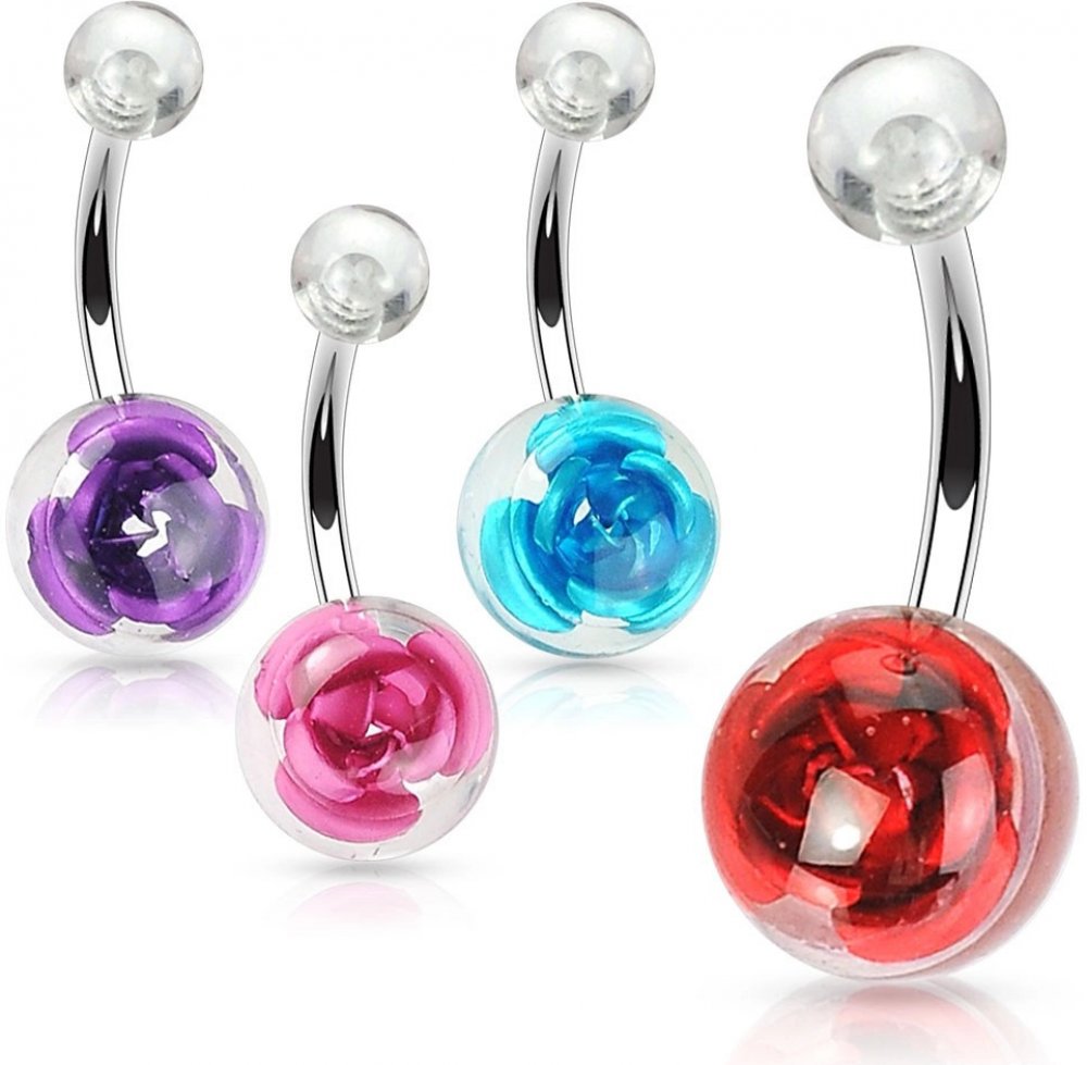 Piercing do pupíku ve tvaru kuličky s barevnou růžičkou uprostřed.