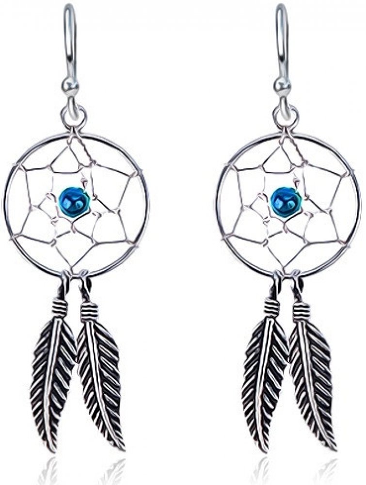 Visací náušnice ze stříbra 925, kruhový lapač snů s výpletem, barevným korálkem a pírky.