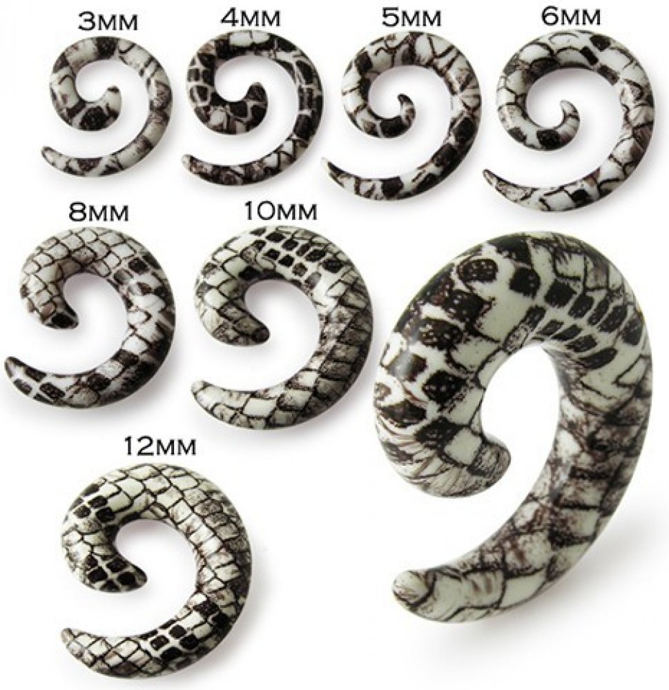 Expander do ucha, spirála se vzorem hadí kůže bílohnědé barvy.