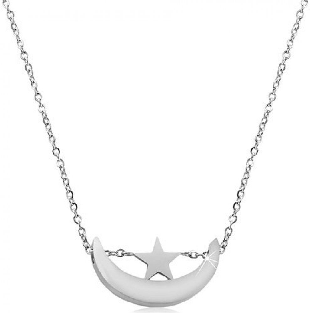 Ocelový náhrdelník ve stříbrném odstínu, řetízek z oválných oček, úzký srpek měsíce a pěticípá hvězda.