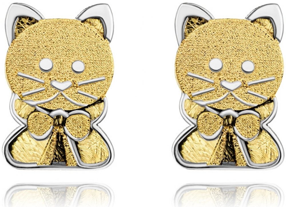 Zlaté náušnice ze 14karátového zlata mají podobu sedící kočky s mašlí na krku. Povrch je upraven kombinací strukturovaného žlutého zlata a hladkého lesklého bílého zlata, které zvýrazňuje detaily designu. Náušnice jsou doplněny pohodlným zapínáním na puzetu pro bezpečné uchycení.
