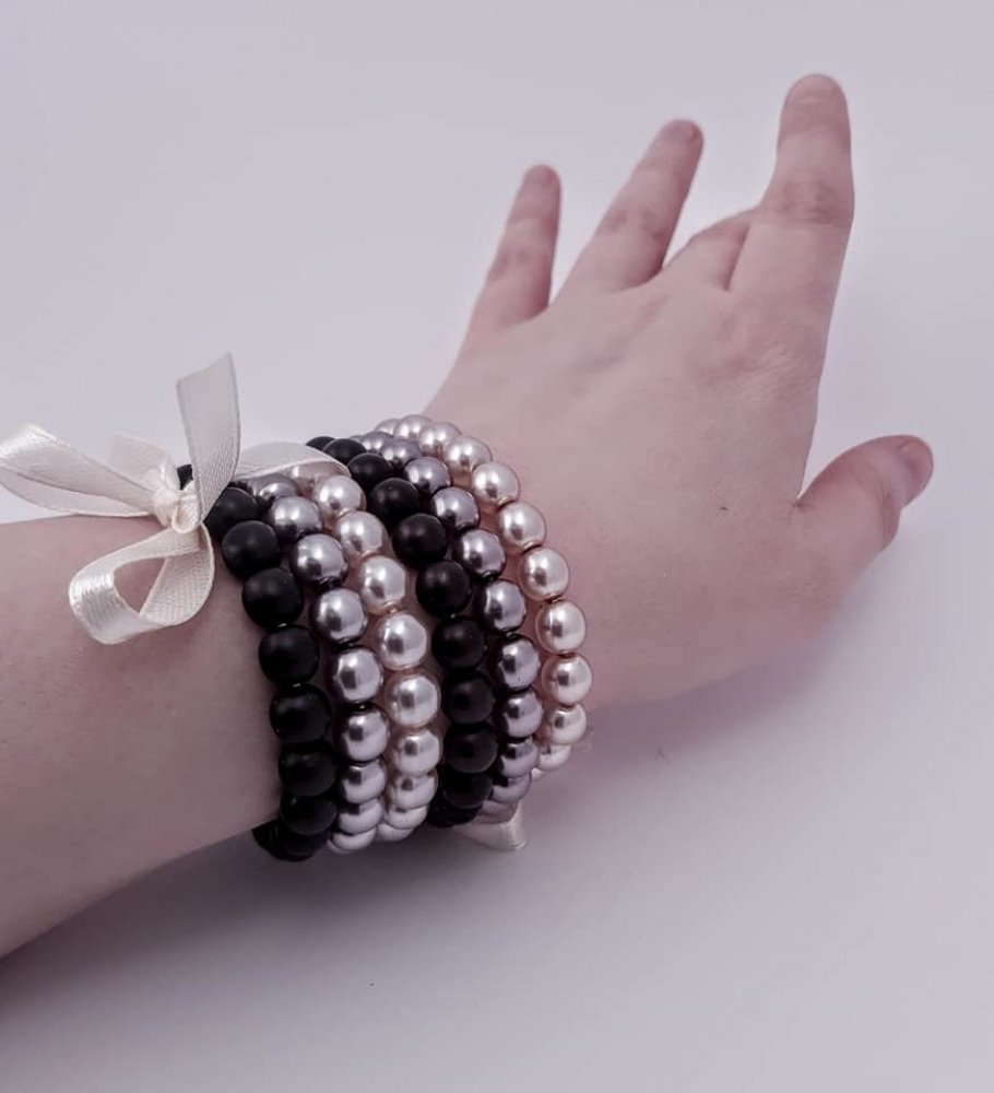 Náramek z Jabloneckého skla 3 kusy, svázané saténovou mašlí. Laděno v harmonii, tak aby barvy vytvořily zajímavý šperk, který nikdo nepřehlédne. Materiál - Jablonecké sklo kuličky 8 mm. Navlečeno na pružném gumičce. 24 ks kuliček v jednom náramku. Váha 3 kusů 45 gramů. Barvy - Šedá lesklá. Průsvitná něžně růžová lesklá. Černá matná. Baleno v saténovém pytlíčku.
