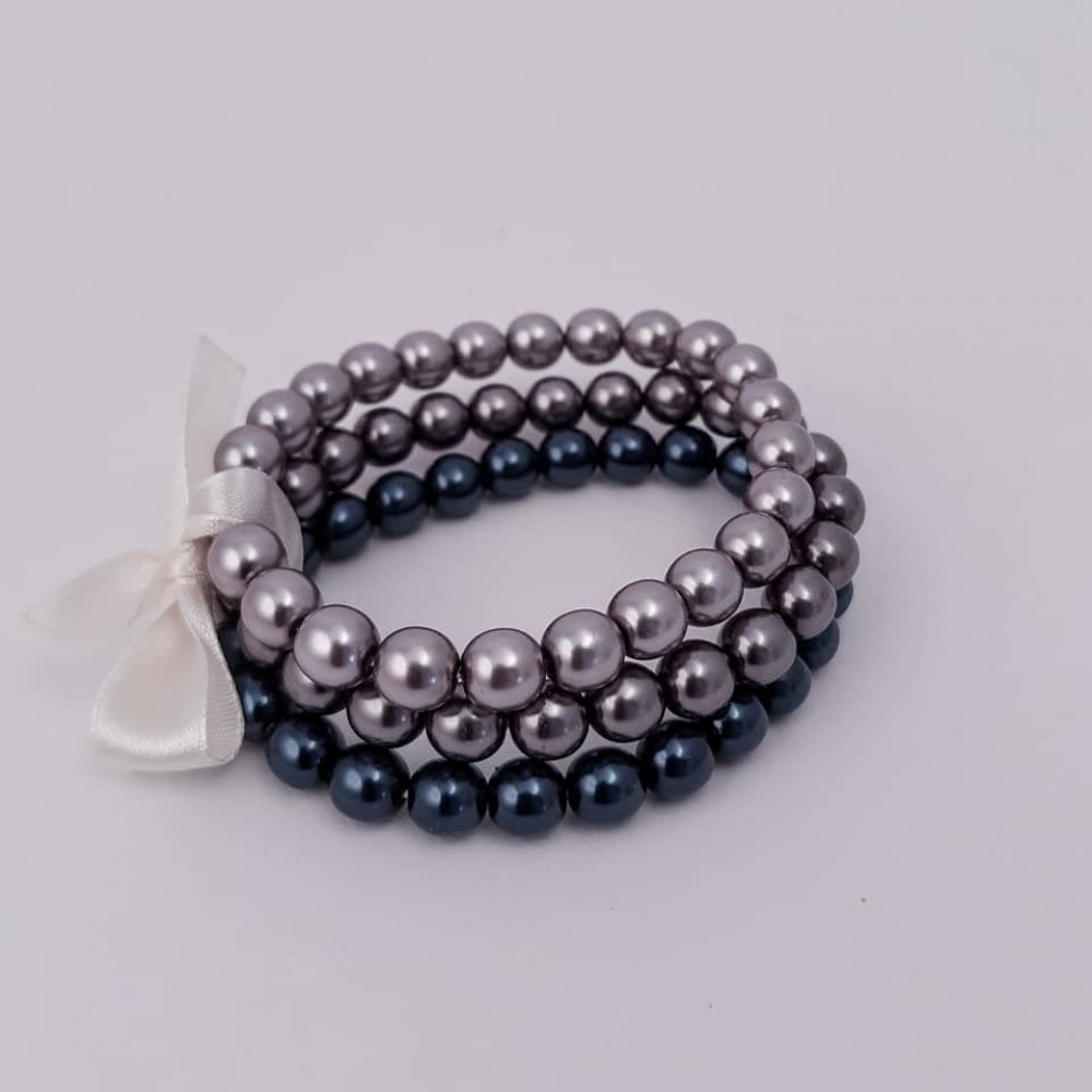 Náramek z Jabloneckého skla 3 kusy, svázané saténovou mašlí. Laděno v harmonii, tak aby barvy vytvořily zajímavý šperk, který nikdo nepřehlédne. Materiál - Jablonecké sklo kuličky 8 mm. Navlečeno na pružném gumičce 24 ks kuliček v jednom náramkuváha 3 kusů 45 gramůBarvy - Středně šedá leskláTmavší šedá leskláKobaltově modrá leskláBaleno v saténovém pytlíčku.